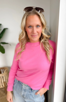A bright layering piece over neutral basics makes color feel wearable and fresh — even in early spring chill. Or vice versa - pair a neutral cream sweater over a pop of pink.