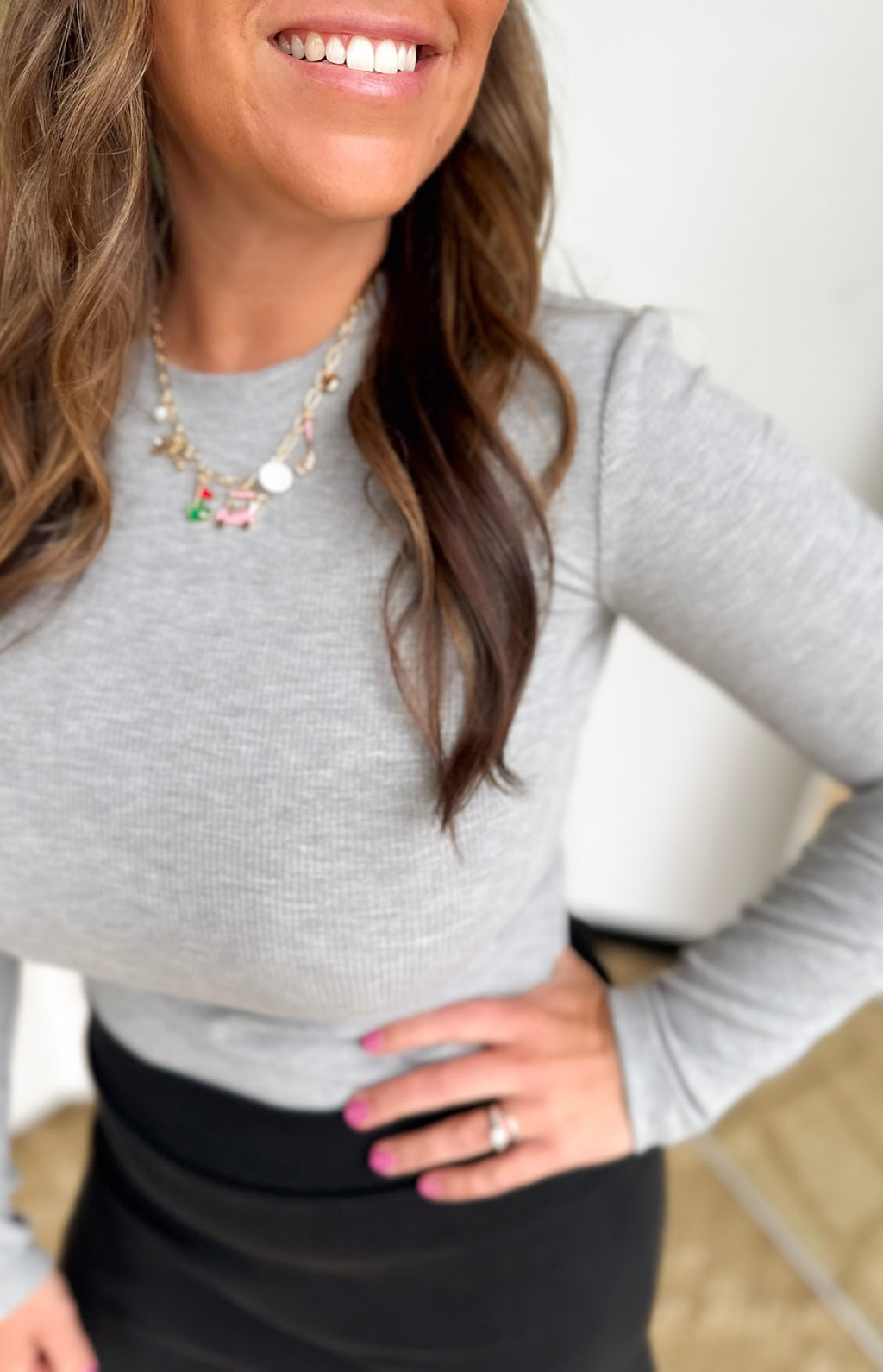 This grey micro-ribbed long sleeve top is one of those pieces you’ll reach for on repeat. The soft, stretchy ribbed fabric gives it a flattering, fitted look while still feeling comfortable enough for all-day wear. Designed with a classic round neckline, it’s an essential for layering under jackets, cardigans, or wearing on its own. The rich heather grey color adds a easy blend to your everyday basics without being hard to style.