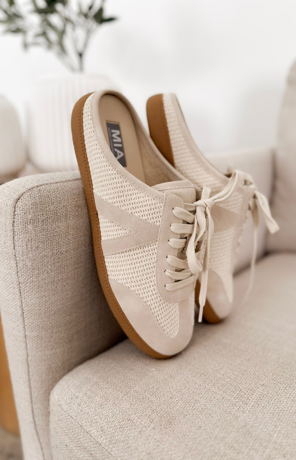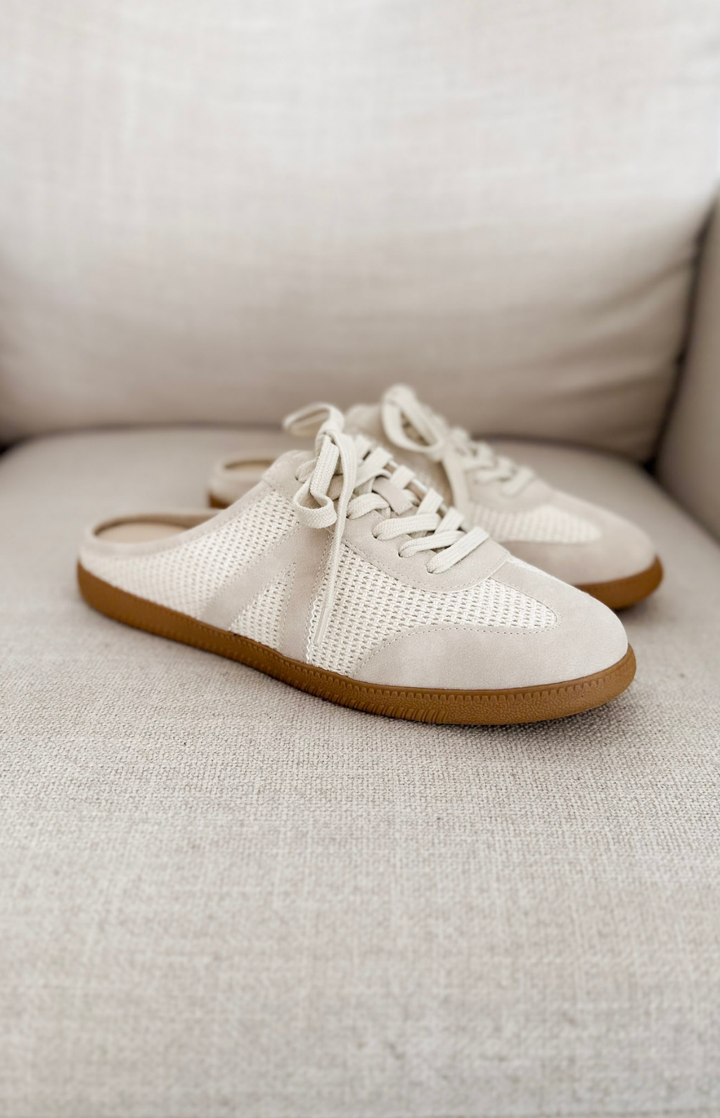 These two-toned taupe mule sneakers bring a fun but relaxing blend of personality while feeling totally wearable. The taupe suede and cream woven fabric contrast detailing blends softly creating the perfect slip on, making them easy to mix with your everyday staples. The slip-on mule design gives you that effortless, on-the-go convenience we all love. Cushioned comfort keeps them practical for long days when you’re constantly moving. Pair them with denim, casual dresses, or athleisure for an instant style boost. They’re the statement sneaker you’ll reach for when you want comfort with a little extra flair