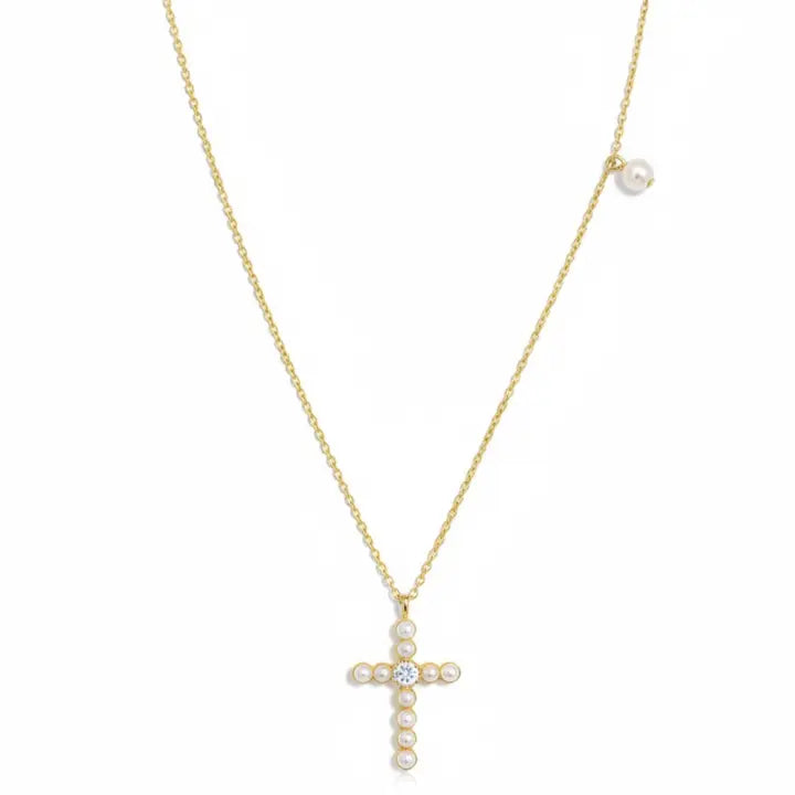 Embrace timeless elegance with the Graceful Radiance Pearl Cross Necklace, featuring a beautifully balanced cross silhouette adorned with lustrous pearls and a radiant central stone. Its refined design and longer chain length make it an effortlessly graceful piece for both meaningful moments and everyday sophistication.