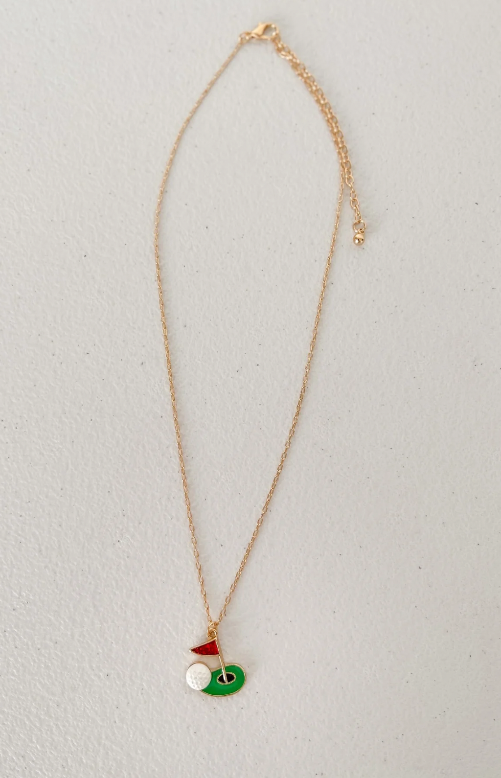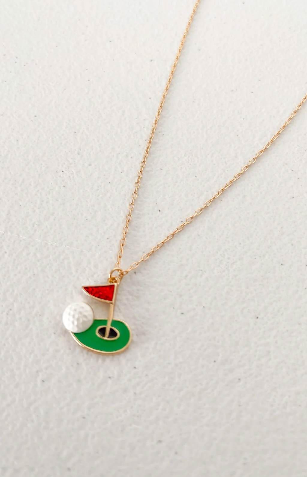 Perfect for golf lovers, this playful necklace features a mini golf course pendant complete with a flag and textured ball. A sporty and fun accessory that adds charm to casual outfits or makes a thoughtful gift for golf enthusiasts