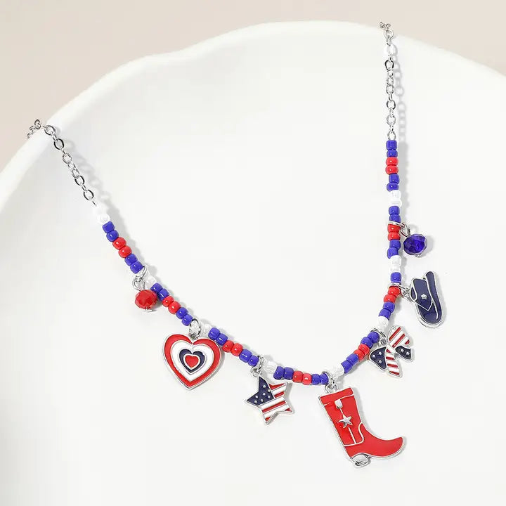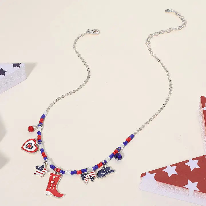 This silver USA beaded charm necklace is a fun little piece that adds the perfect patriotic touch to your outfit. Featuring classic American-themed charms with red, white, and blue beads throughout the bottom of the chain, it brings just the right pop of color and personality. It’s an easy accessory to throw on with your favorite tee, tank, or sweatshirt when you want your outfit to feel a little more festive.