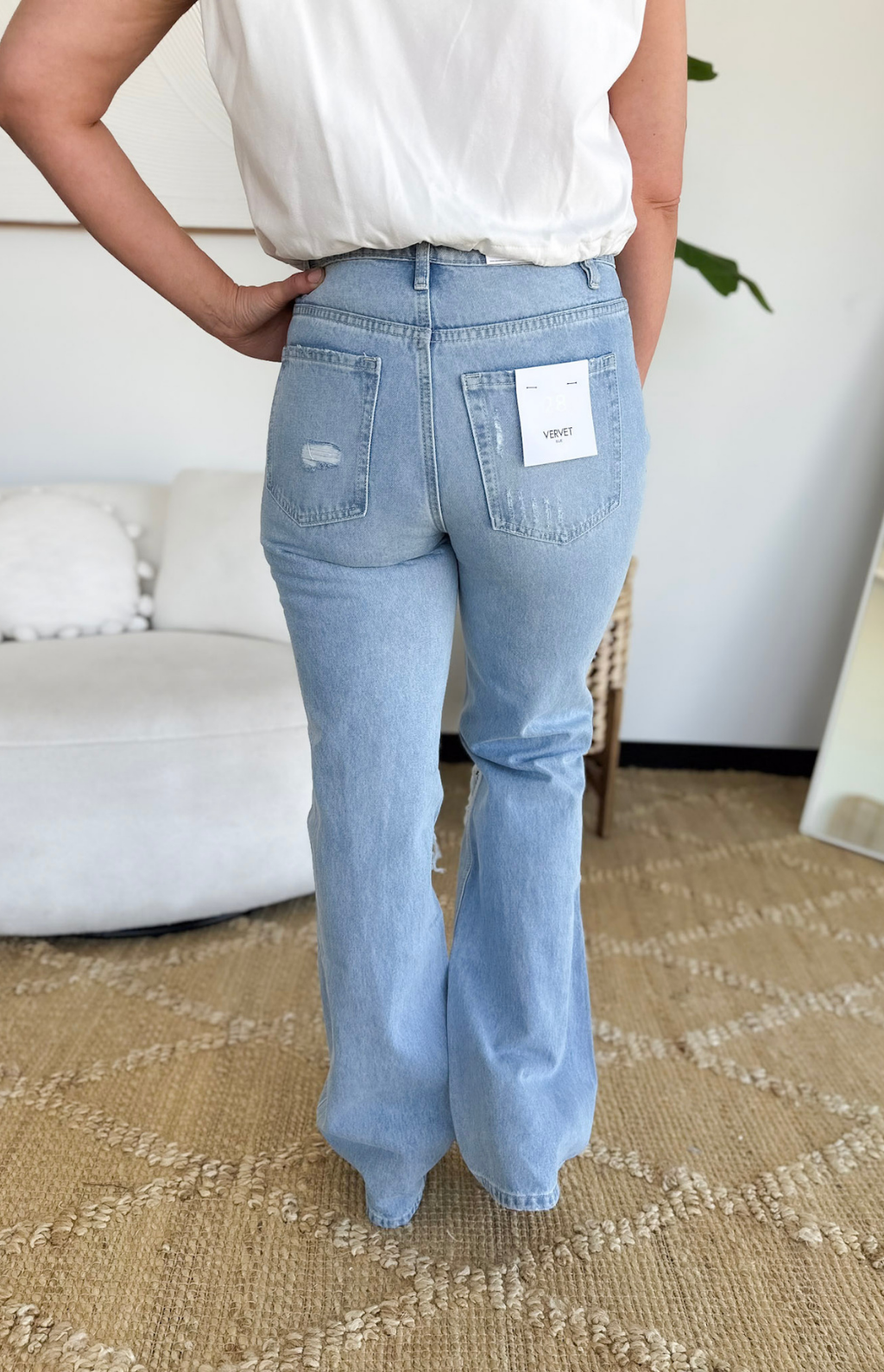 - Details: High rise, fabric has no stretch, tapered flare fit, light wash, light distressing throughout, knee slits with distressing zip and button closure, inseam: 33.5”