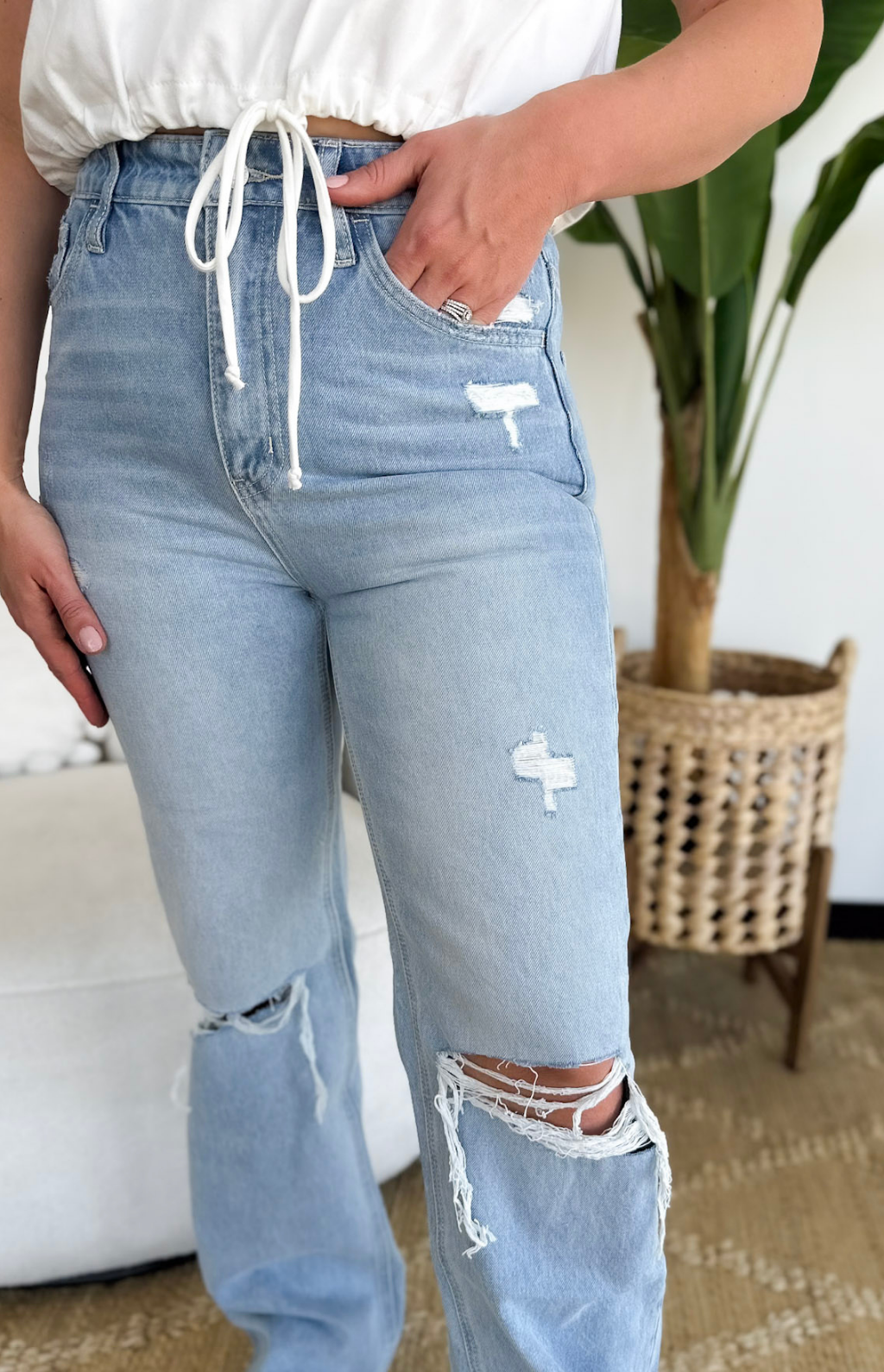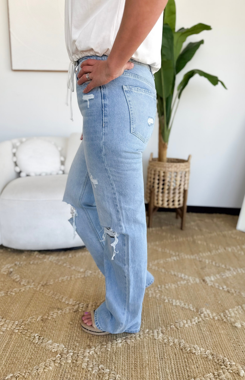 These light wash flare jeans are the kind of denim that instantly brings a cool, vintage feel to your everyday look. The high-rise fit offers a comfortable, flattering silhouette that hugs in all the right places, while the flared leg creates that effortless ‘90s-inspired shape. Distressing is scattered throughout for a perfectly worn-in vibe, and the knee slits add just the right amount of edge without feeling overdone. The flare gives you that laid-back, on-trend look that pairs easily with everything from fitted tanks to oversized sweaters, making them bold yet versatile for days when you want to feel effortlessly put together.
