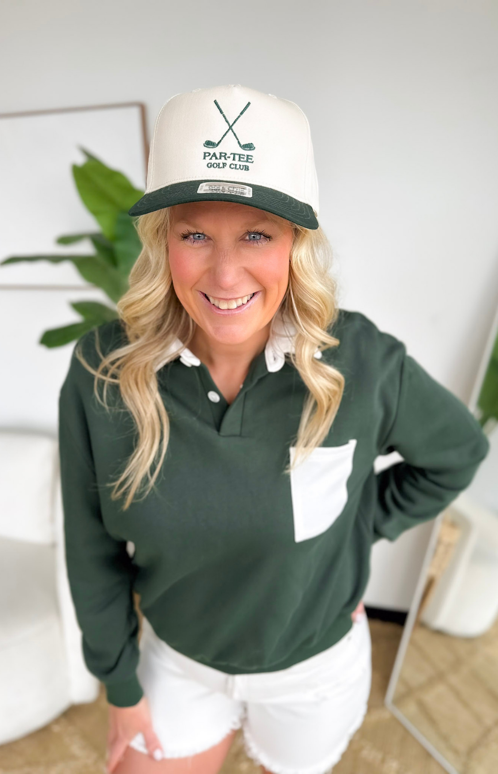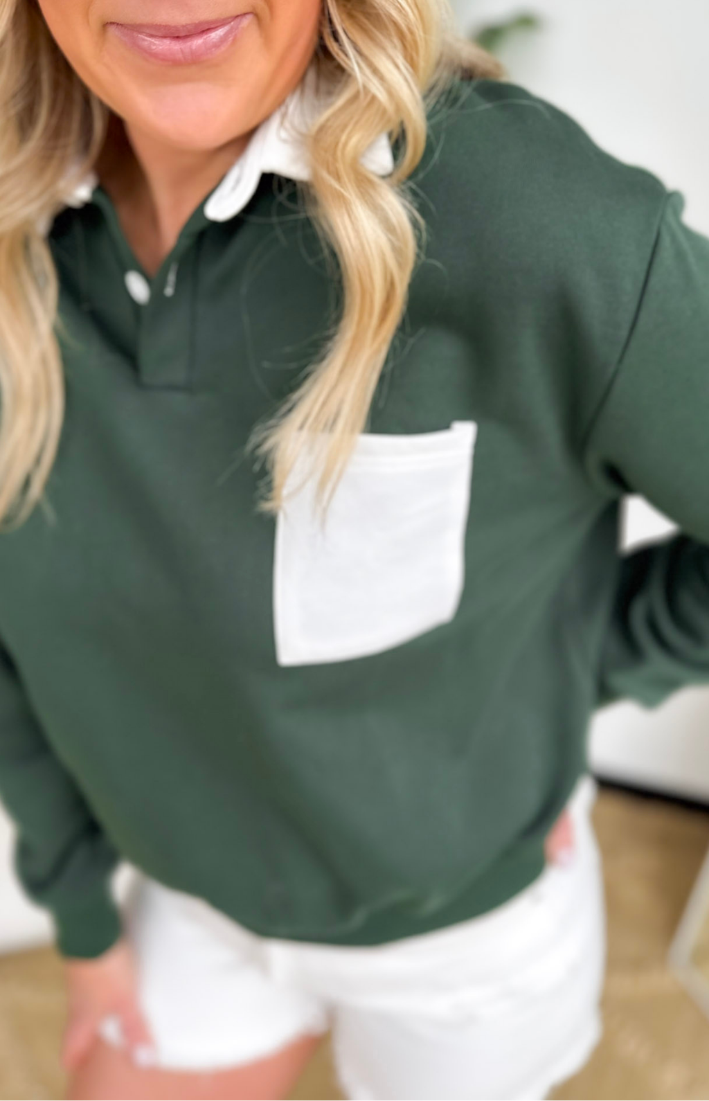 This two-tone polo collared pullover is the kind of piece that makes getting dressed feel effortless. The rich forest green sweatshirt is paired with crisp white details on the collar, pocket, and buttons for a fresh, sporty look that stands out in the best way. The collared neckline adds a slightly polished touch while still keeping the comfort of your favorite sweatshirt. It’s an easy throw-on piece for busy mornings when you want to feel put together without thinking twice.