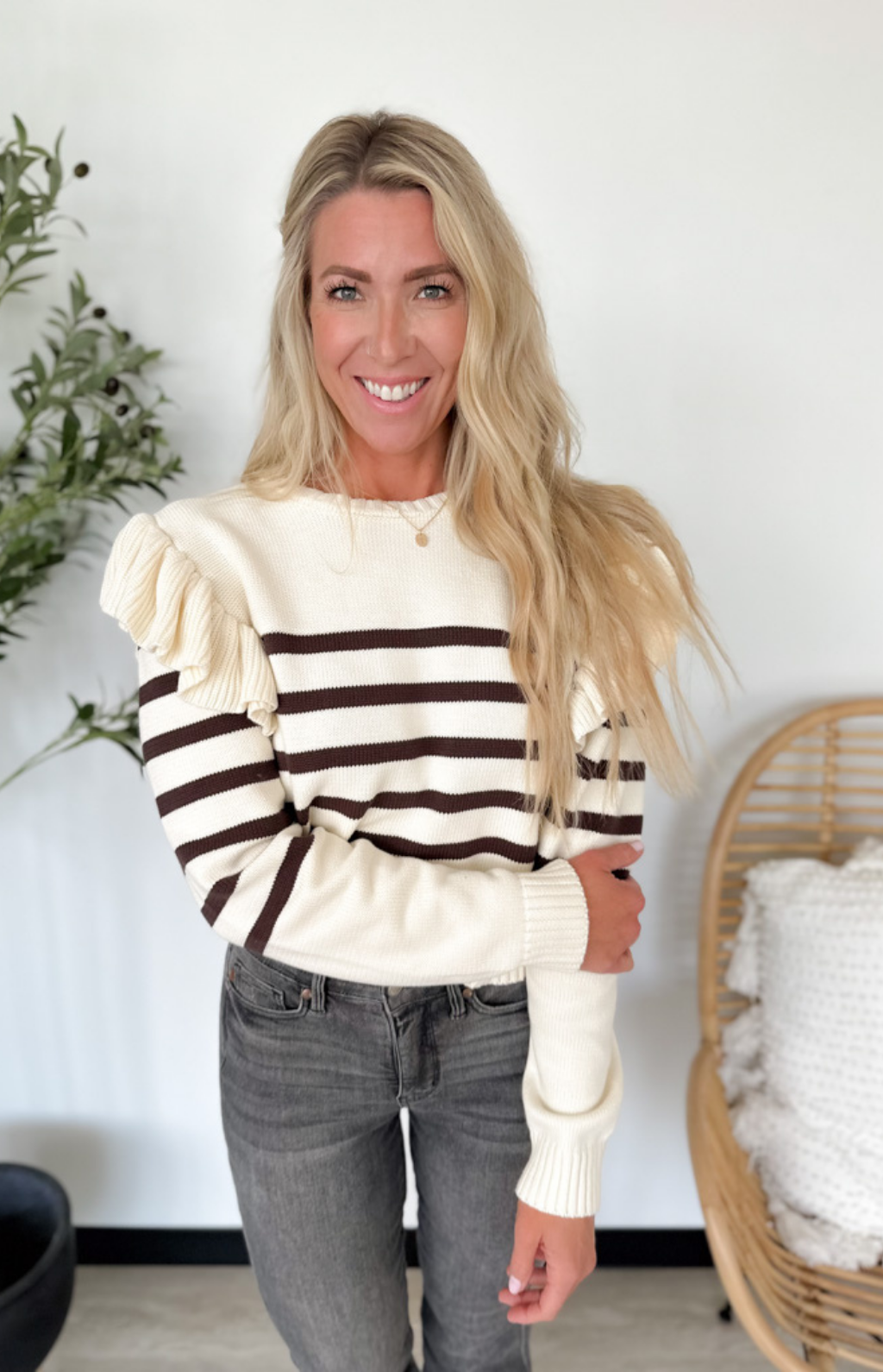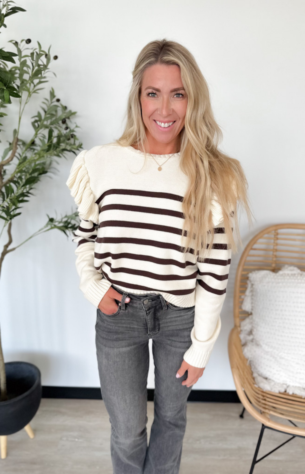 Striped Knit Sweater with Ruffle Sleeve Detail