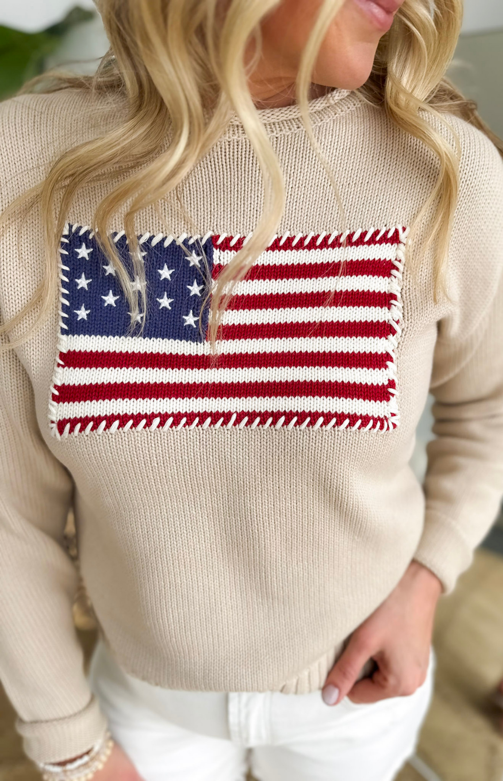 This beige knit sweater with a stitched American flag is the perfect mix of cozy and patriotic. Lightweight and breathable, it’s ideal for summer nights, lake days, and breezy evenings by the fire. The knitted flag detail adds a timeless, classic touch without feeling overdone. Has chunky off-white thread to give it a relaxing look, while the embroidered stars add the perfect final touch.