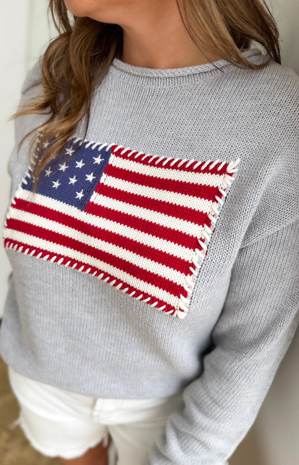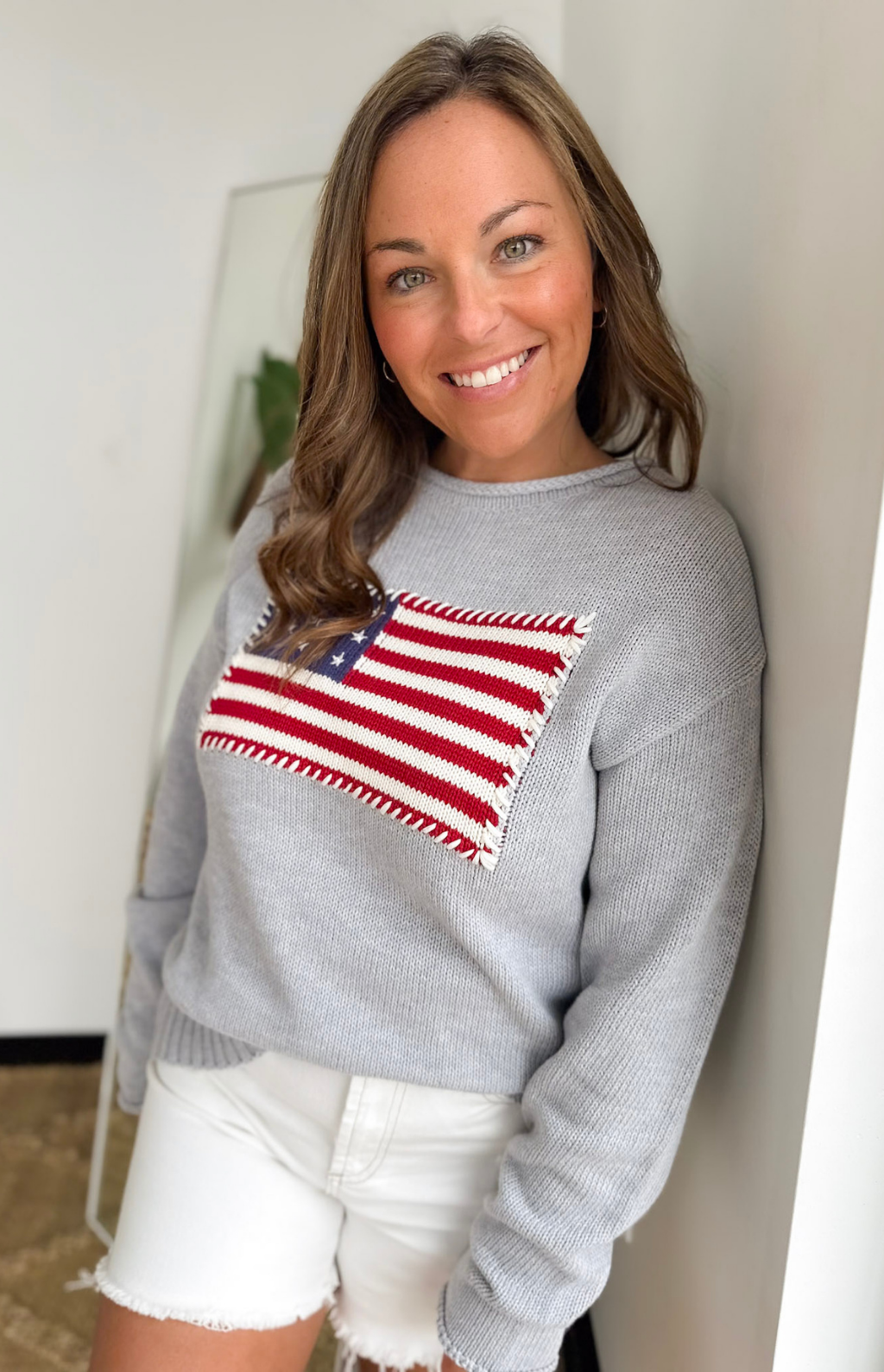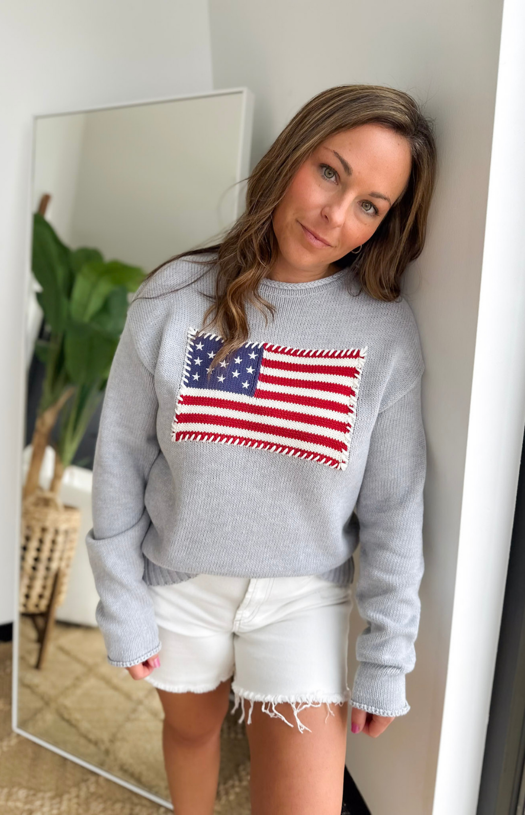 This grey knit sweater with a stitched American flag is the perfect mix of cozy and patriotic. Lightweight and breathable, it’s ideal for summer nights, lake days, and breezy evenings by the fire. The knitted flag detail adds a timeless, classic touch without feeling overdone. Has chunky off-white thread to give it a relaxing look, while the embroidered stars add the perfect final touch.