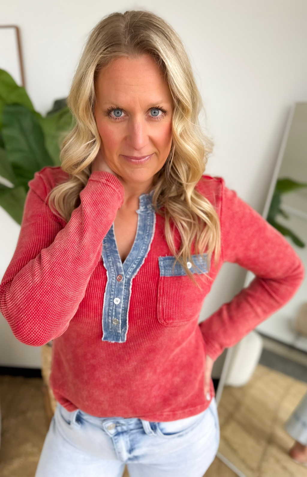This red mini waffle knit long sleeve top is a standout basic with the sweetest details. The fitted silhouette gives you a flattering, polished look, while the soft waffle texture keeps it comfortable for all-day wear. The unique denim trimming along the v-neckline and chest pocket adds just the right touch of contrast and personality. The bold washed red color gives a flattering distressed look that we all love, perfectly lived in but brand new at the same time.