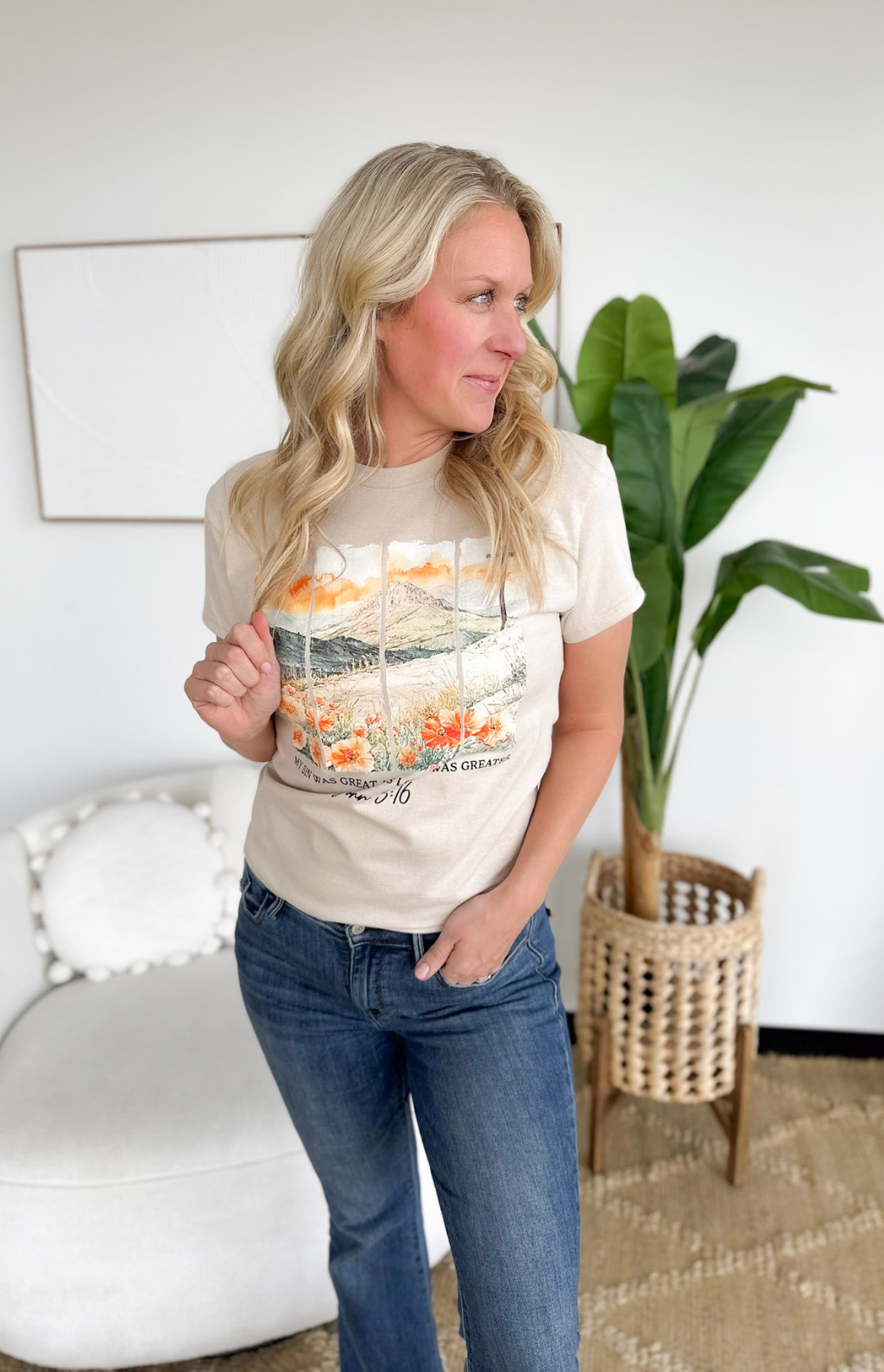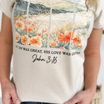 This sand-colored graphic tee is a beautiful reminder of truth you can wear with confidence. Featuring the message “My Sin Was Great, His Love Was Greater” with John 3:16 on the front, it’s both meaningful and easy to style. The soft, neutral tone pairs perfectly with denim, joggers, or layered under a cardigan for everyday wear.