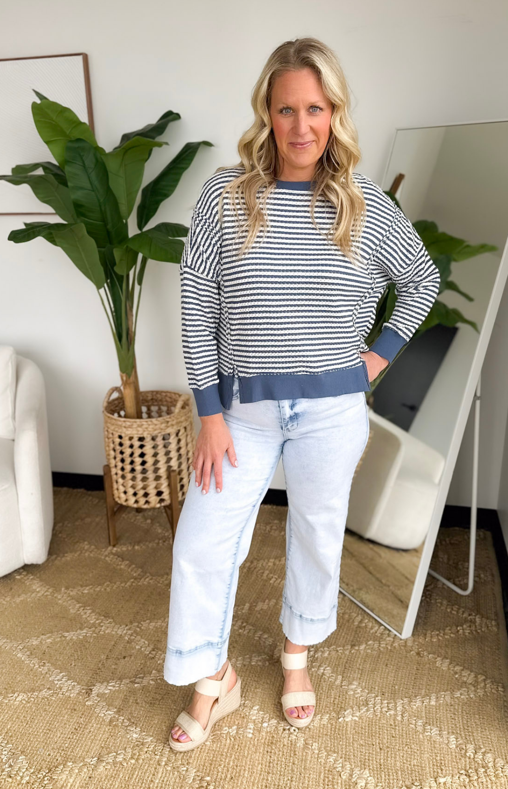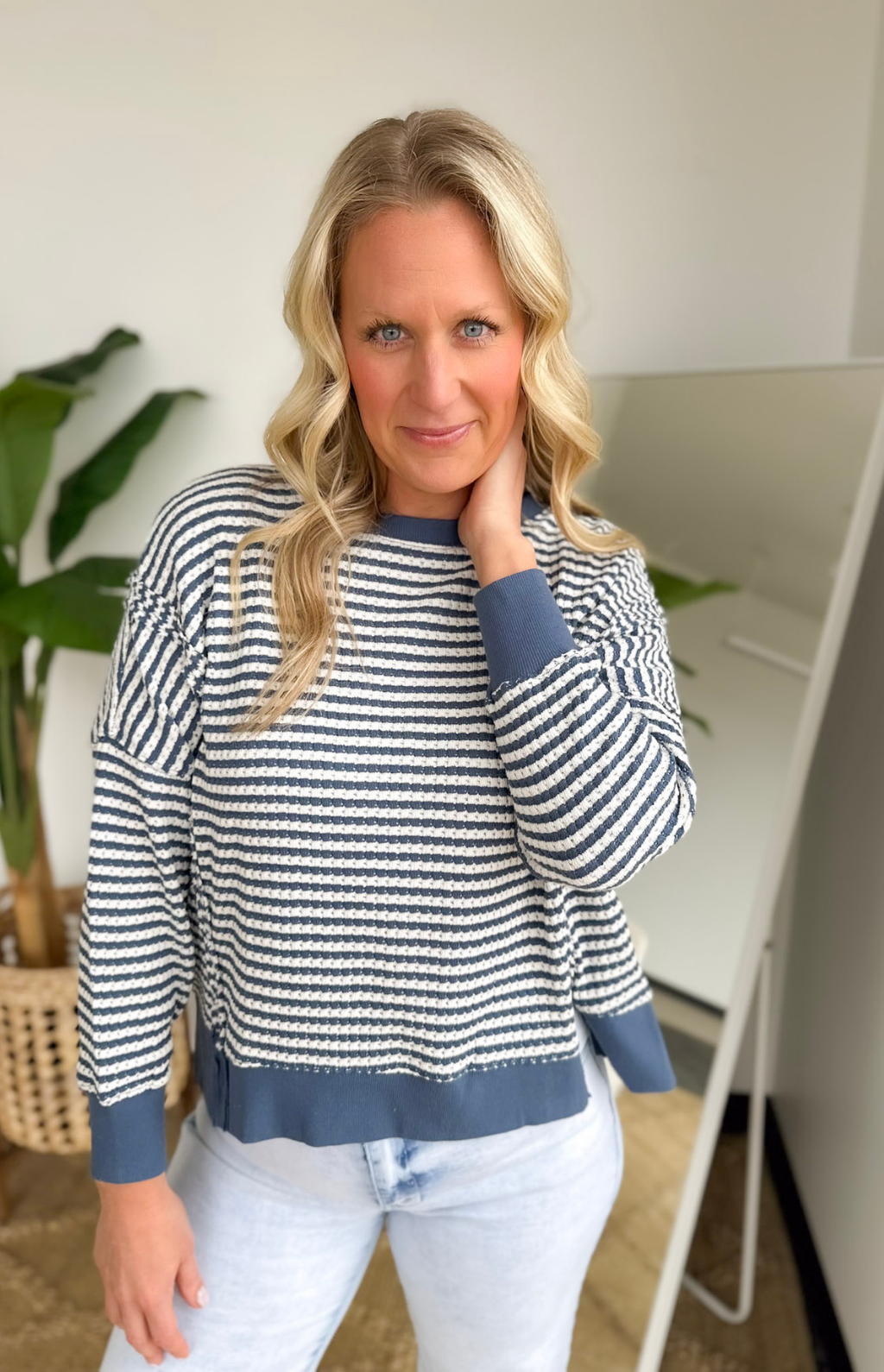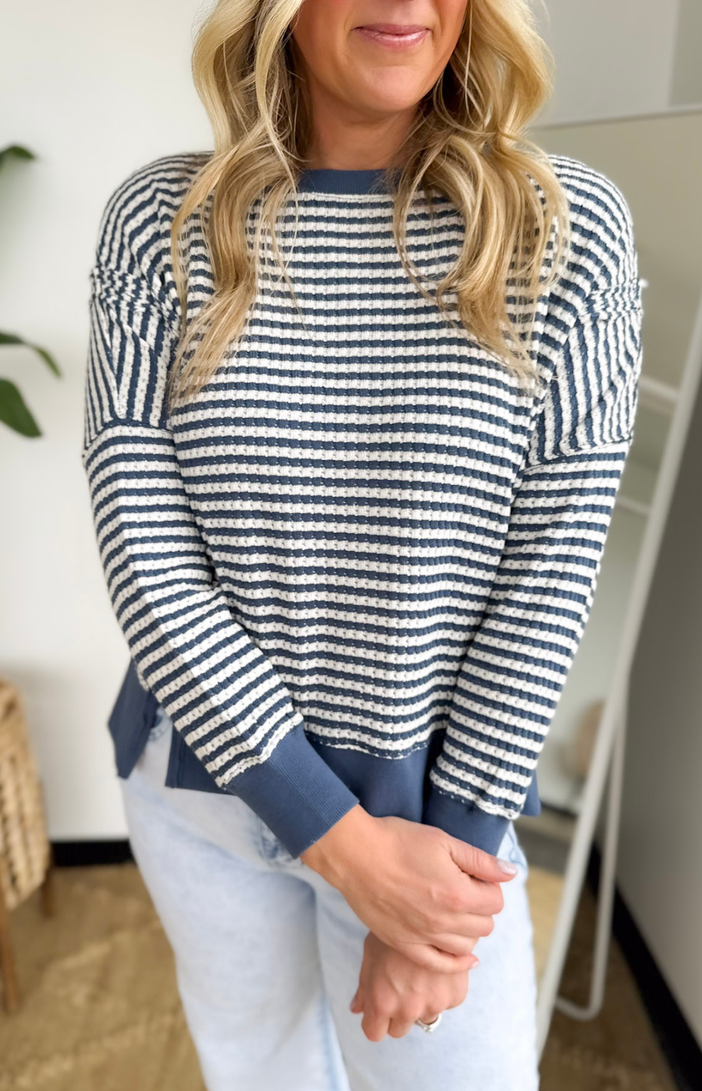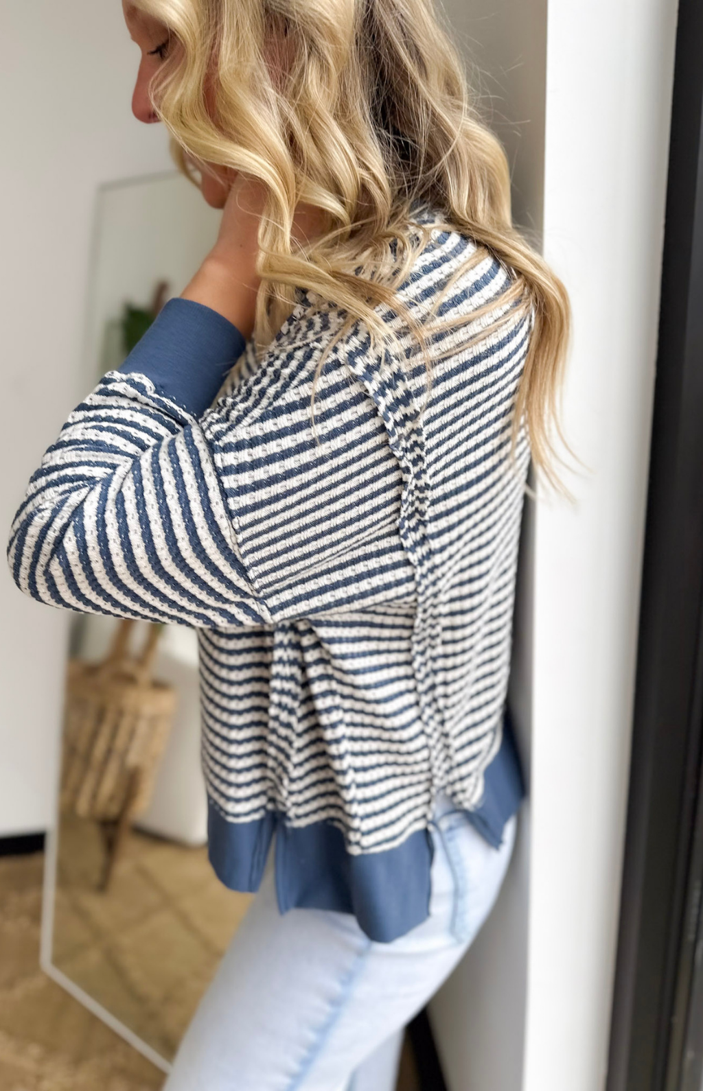 This denim blue and ivory striped knit top is the perfect mix of relaxed and effortlessly styled. The loose, comfortable fit makes it an easy grab for busy days, while the reversed raw seam details add a laid-back, lived-in feel. Contrast along the hemline, neckline, and cuffs gives it that extra pop that makes it feel intentional without trying too hard. Side slits add movement and make it easy to front tuck or wear loose with your favorite denim or leggings.