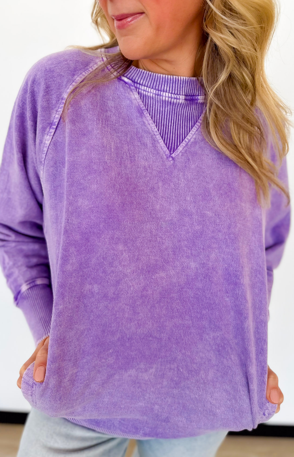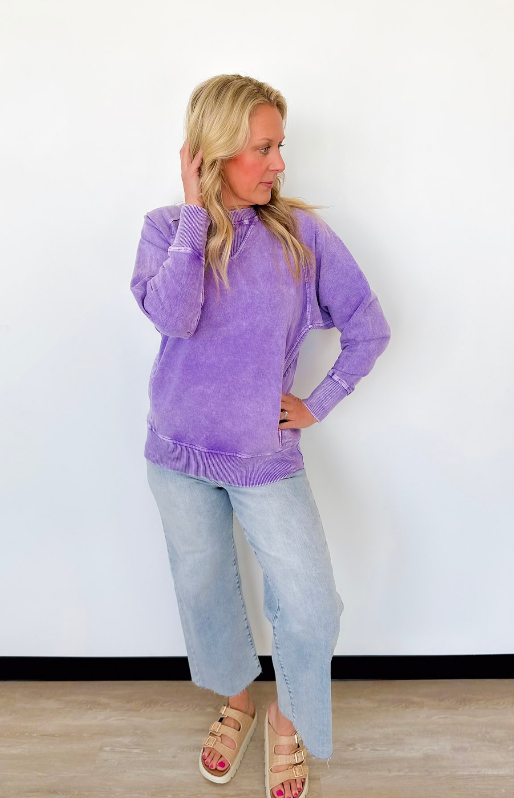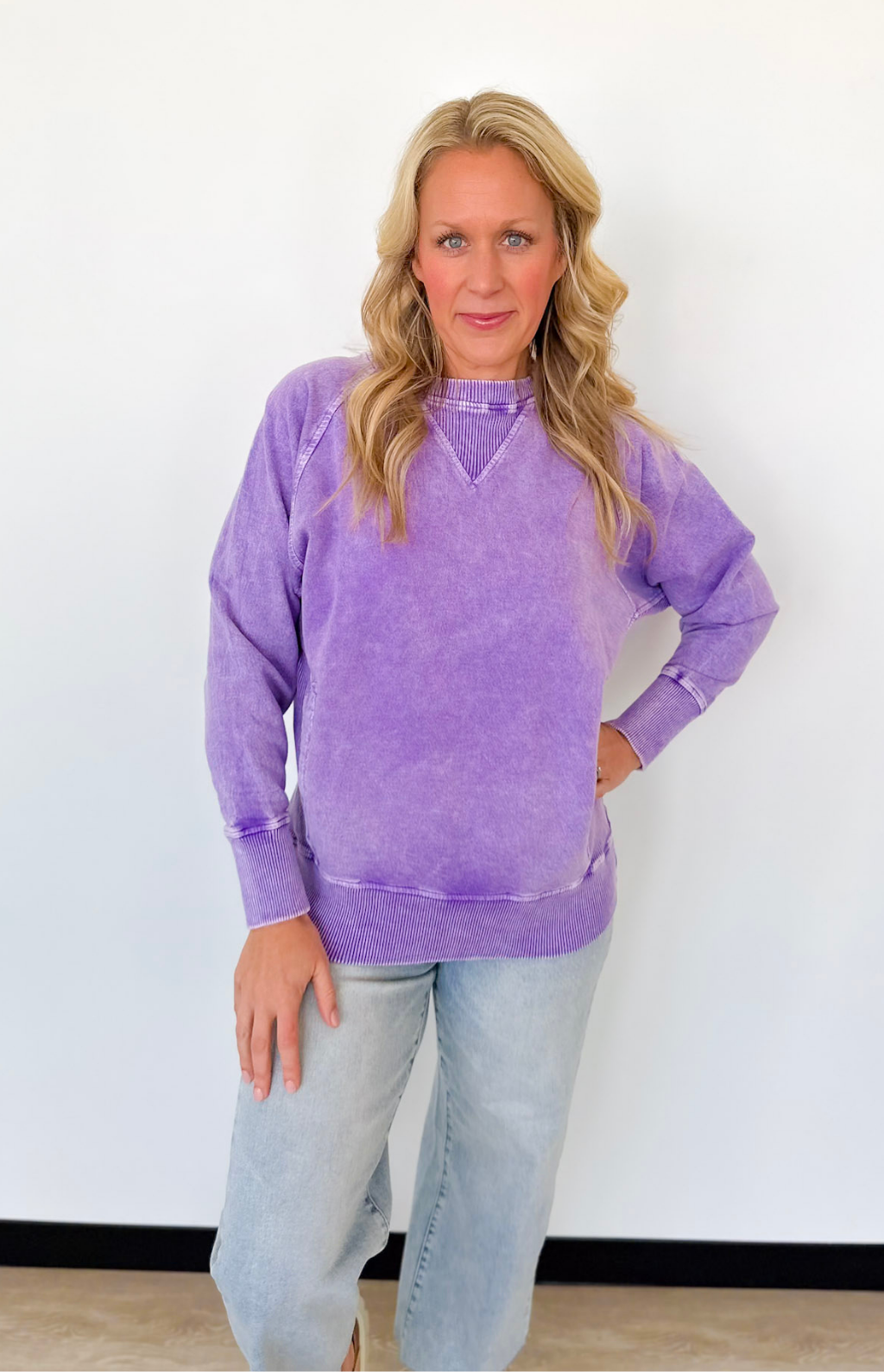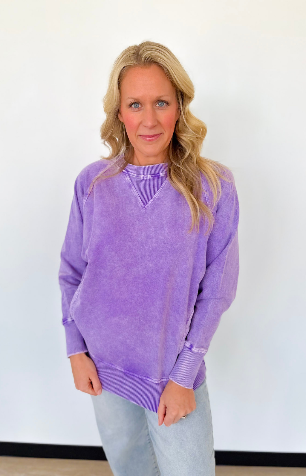 This purple acid wash pullover is one of those easy pieces you’ll reach for on repeat. The lightweight fabric makes it perfect for layering or wearing on its own during busy days on the go. A classic crew neckline keeps it flattering and fuss-free, while the front pockets add that practical touch we all love.