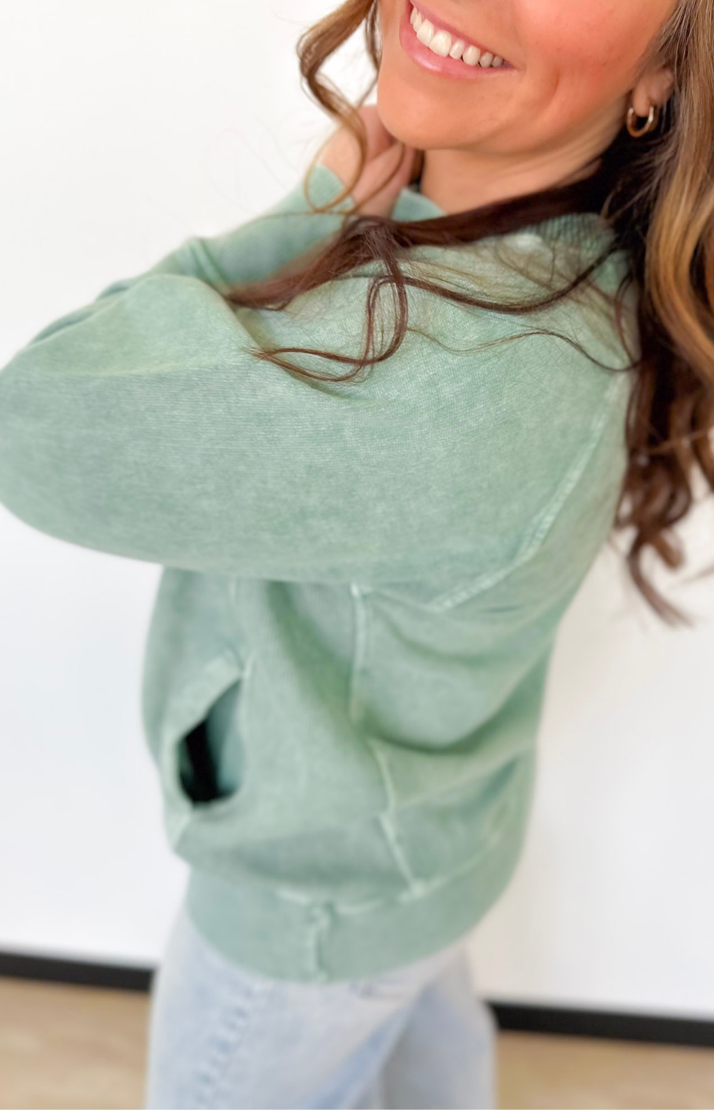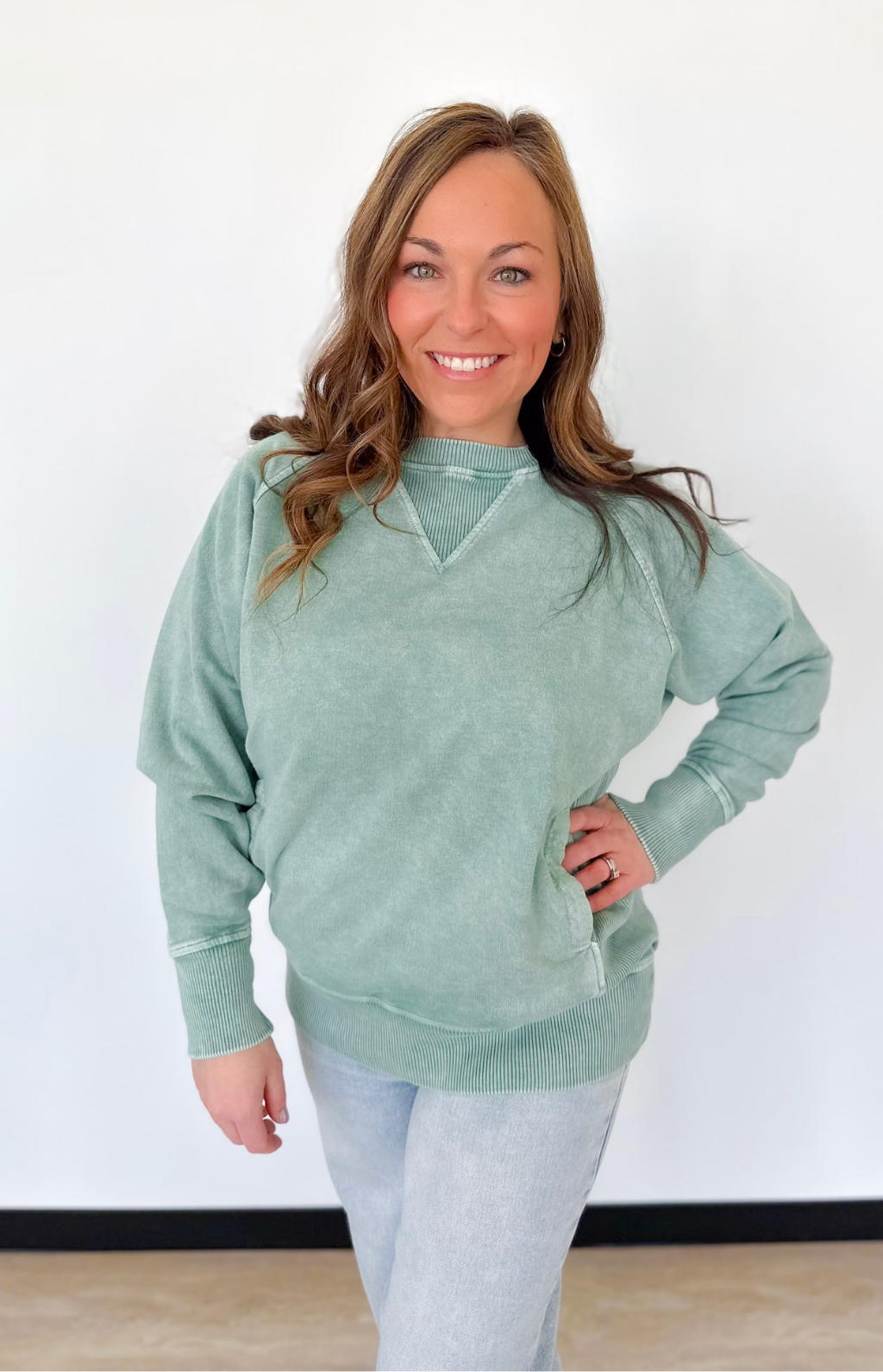 This teal acid wash pullover is one of those easy pieces you’ll reach for on repeat. The lightweight fabric makes it perfect for layering or wearing on its own during busy days on the go. A classic crew neckline keeps it flattering and fuss-free, while the front pockets add that practical touch we all love.