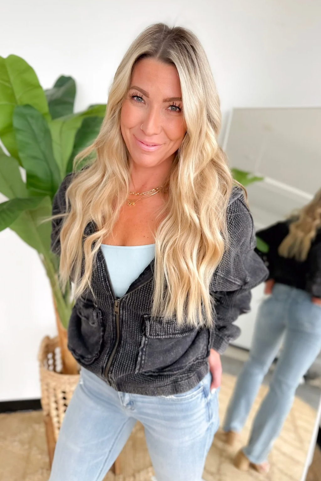 Waffle Knit Hoodie Zip Up Cropped Jacket