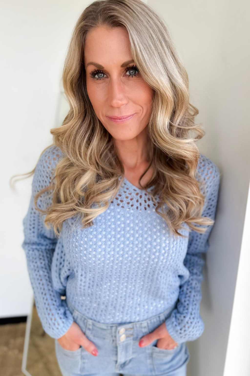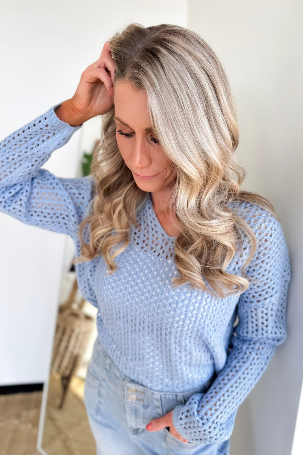 Blue Open Knit Split Neck Top