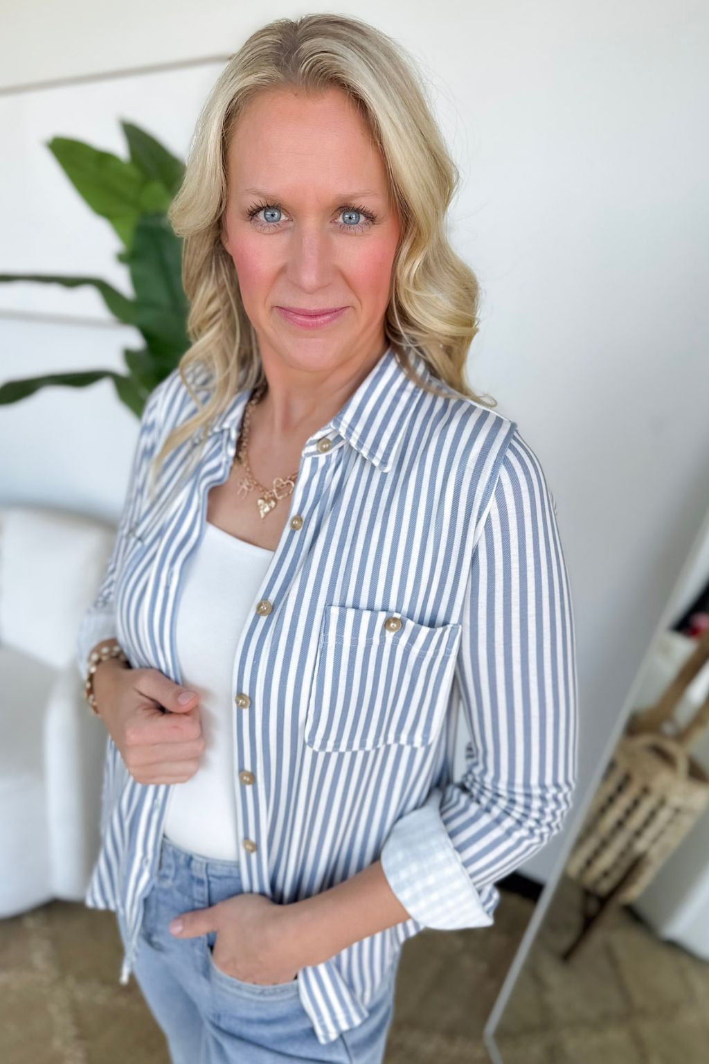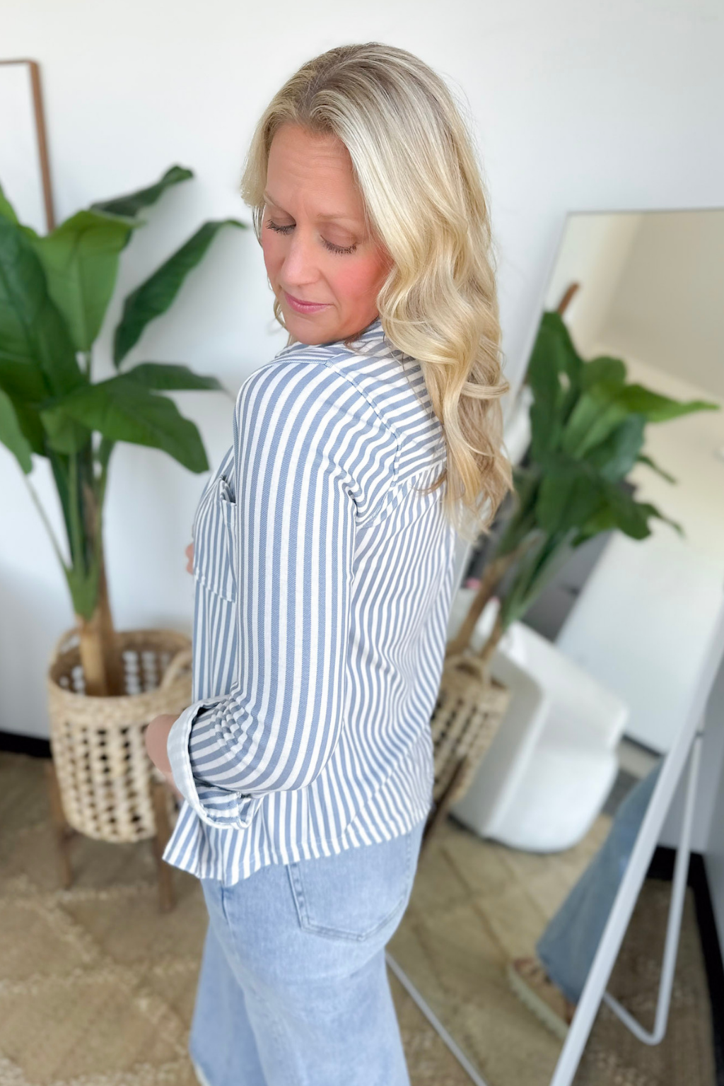 Chambray Vertical Striped Short Sleeve Top