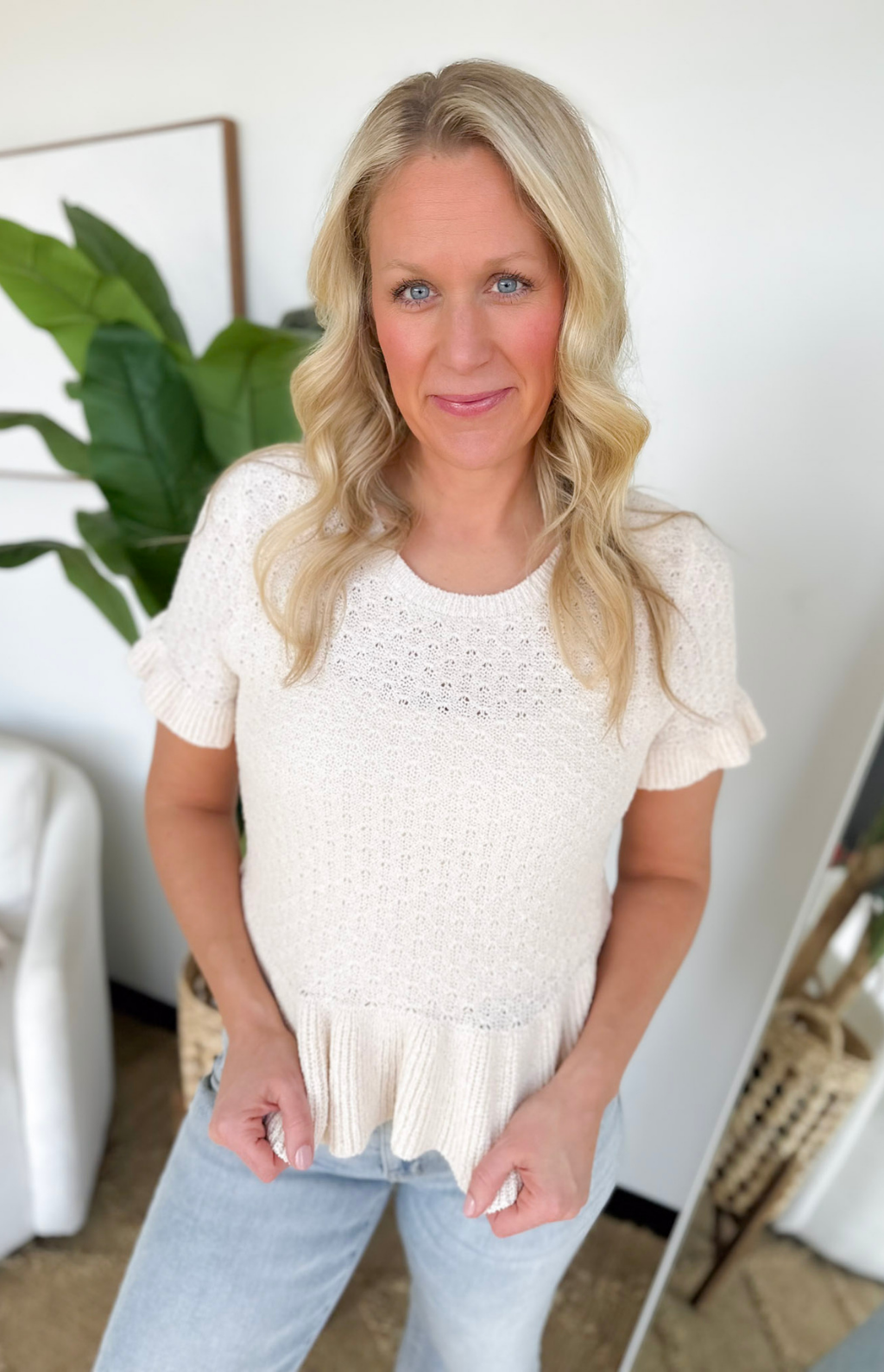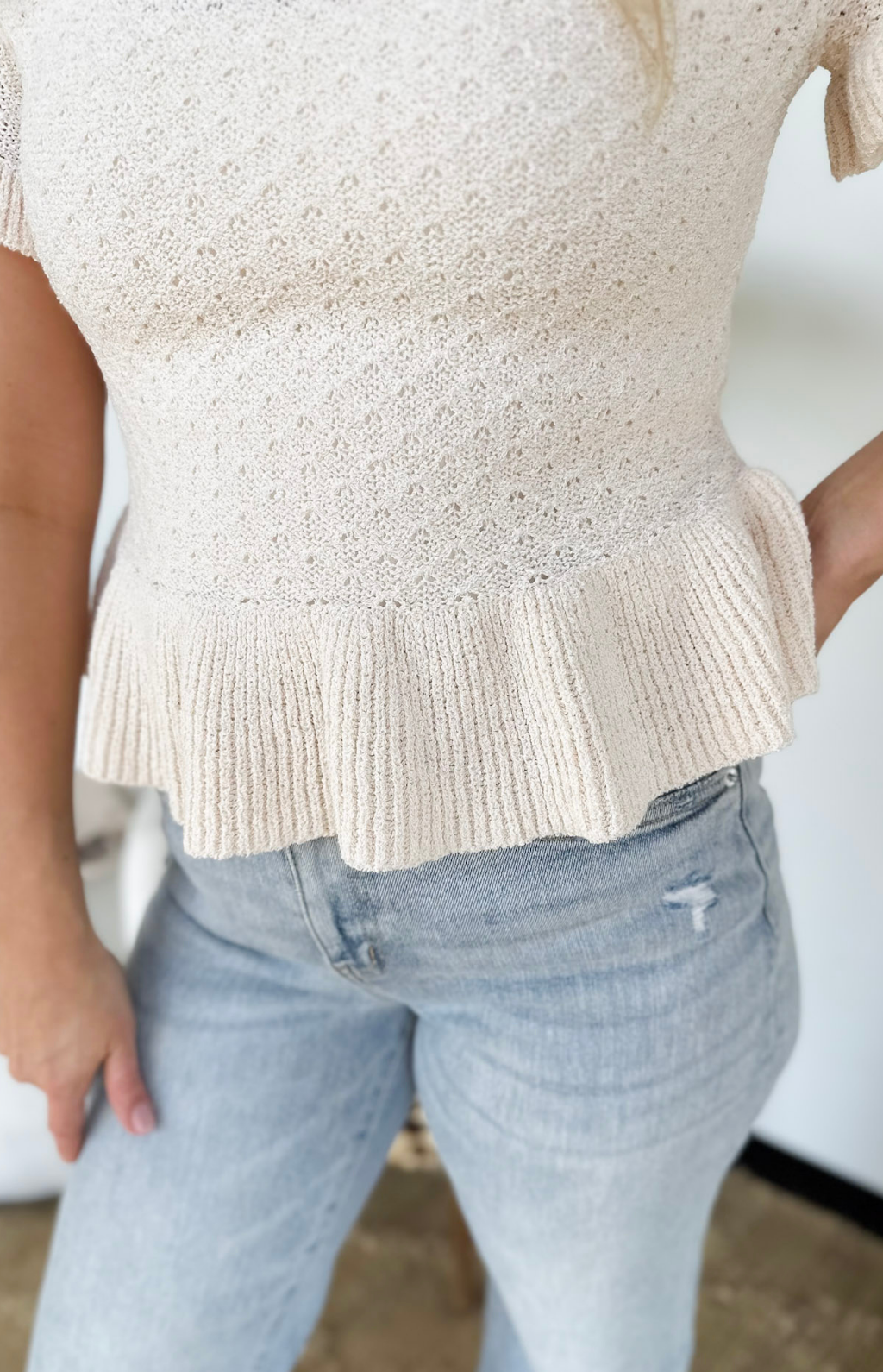 This natural pointelle knit short sleeve sweater top is such a sweet mix of feminine and everyday wearability. The delicate pointelle texture adds soft detail, while the ruffle sleeves and ruffled waistband create a flattering, easy silhouette that feels light and airy. It’s perfect for busy days when you want to look put together without overthinking your outfit.
