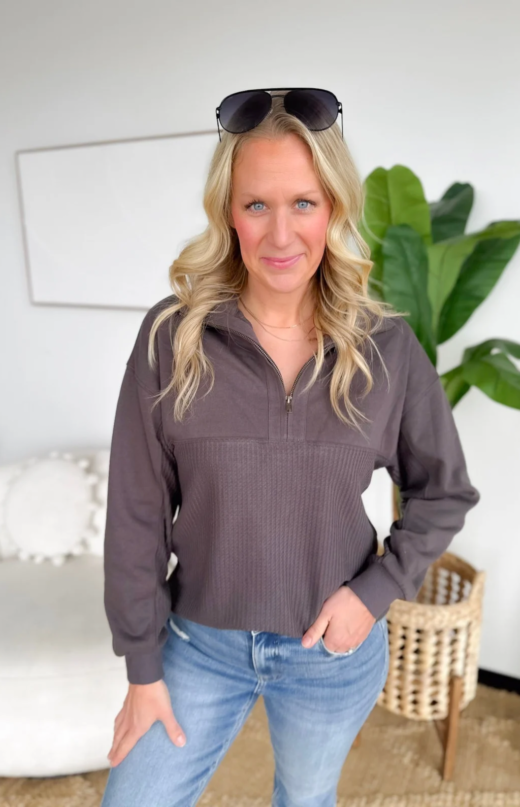 Grey Contrast Waffle Knit 1/2 Zip Pullover