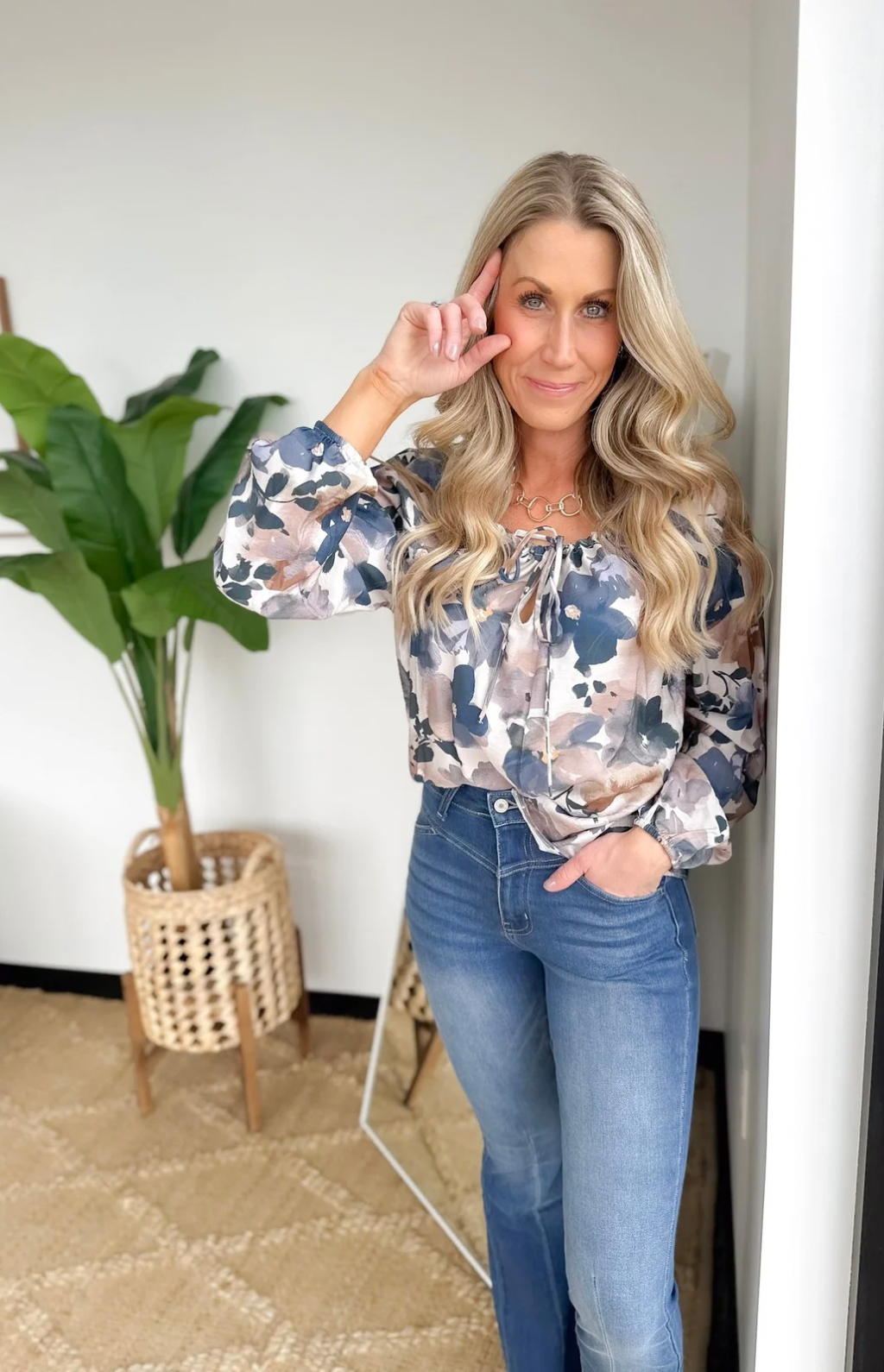 Blue/Taupe Floral Long Sleeve Top