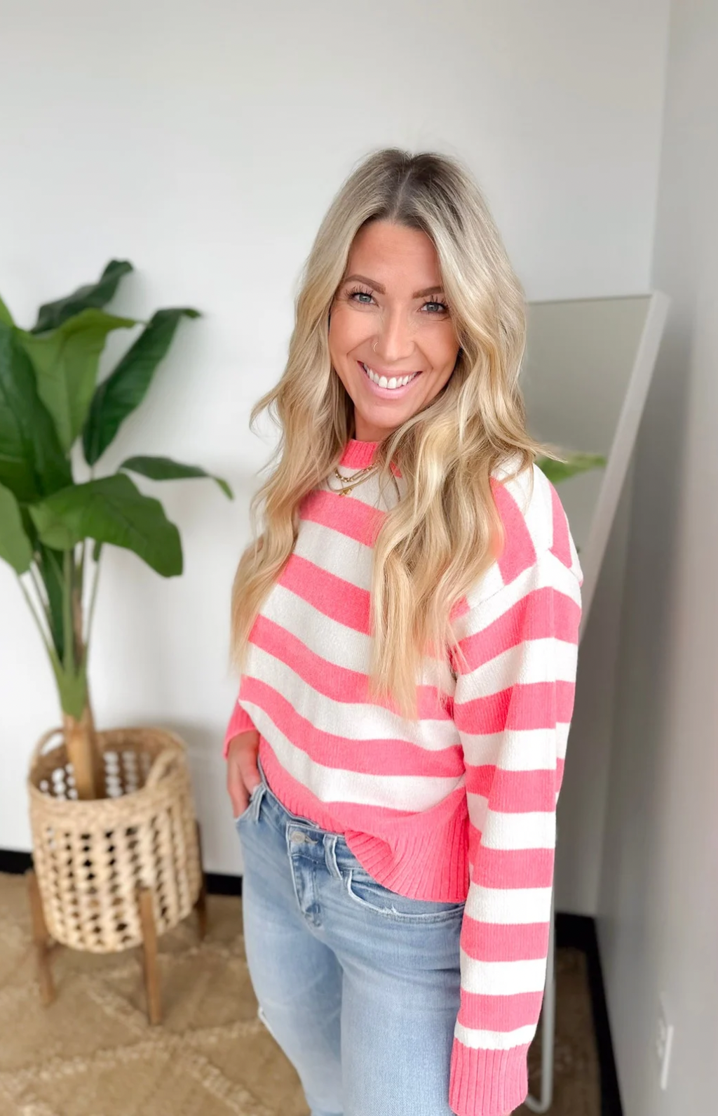Bright Pink and Cream Striped Soft Knit Sweater