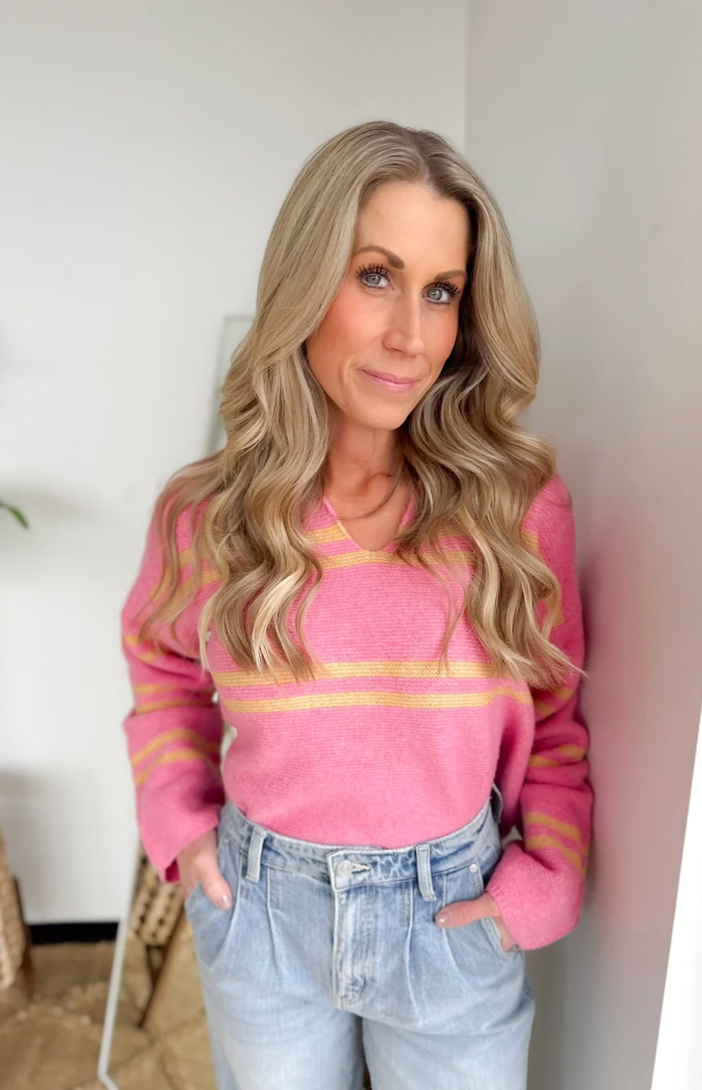 Soft Pink Knit Yellow Stripes Collared Sweater