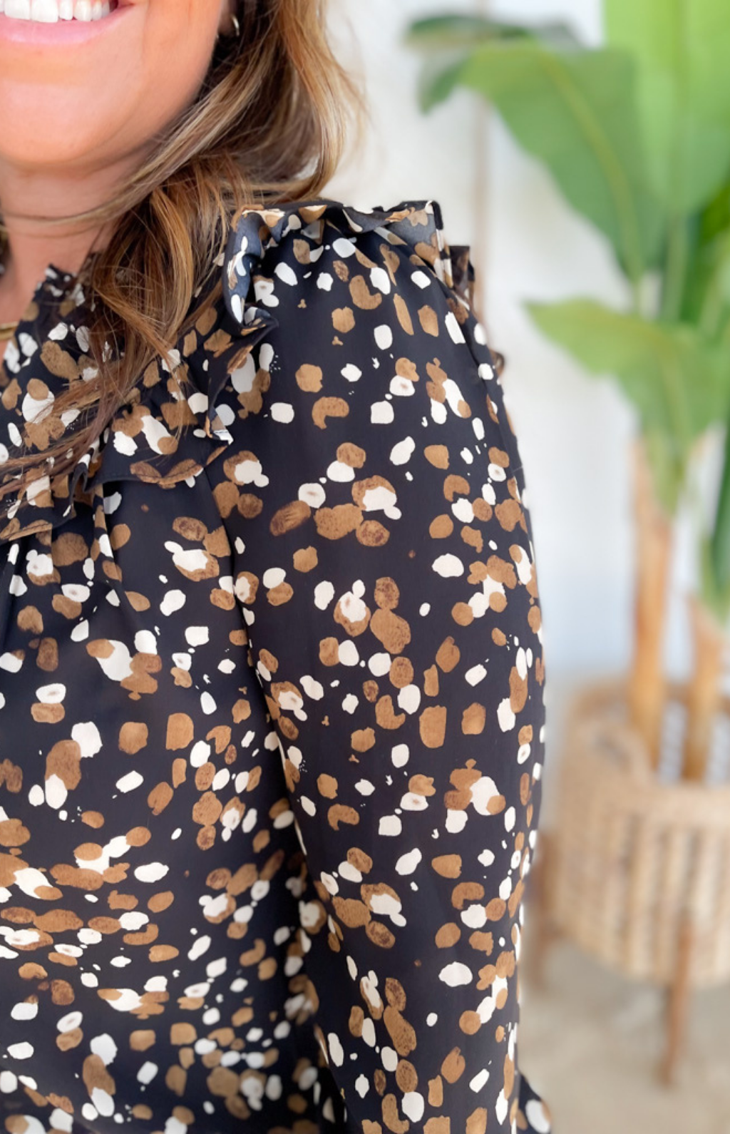 Bring a little flair to your wardrobe with this abstract long sleeve blouse! Designed with a flattering v-neckline and delicate ruffle details, it adds just the right amount of feminine charm. The flowy fit makes it easy to dress up with trousers or keep casual with denim, giving you endless styling options. Effortless yet eye-catching, this blouse is perfect for days when you want your outfit to feel polished without trying too hard!