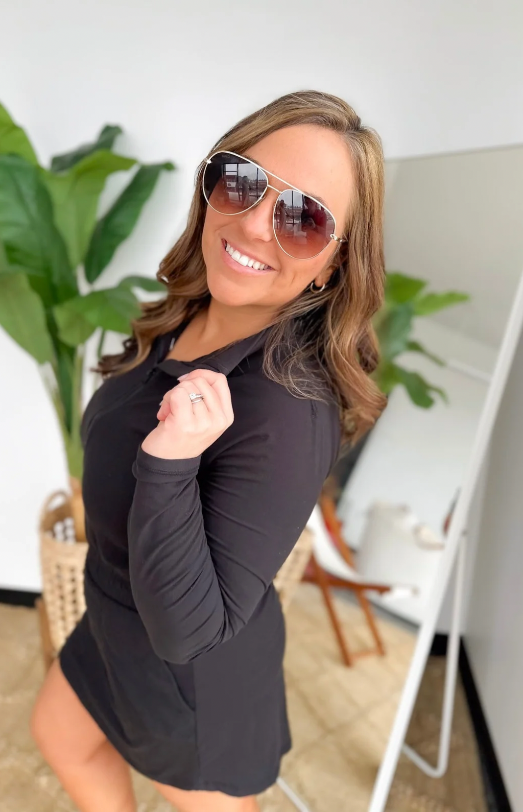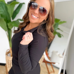 This black long sleeve romper is the perfect mix of polished and playful for days when you want one easy outfit that does it all. The collared neckline with a zipper detail adds a sporty, elevated touch, while the elastic waistband gives you a flattering, comfortable fit. A skirt overlay creates the look of a dress with the ease of a romper—yes please. And pockets, because they’re a must. It’s an effortless throw-on piece that keeps you confident, comfortable, and completely pulled together from morning to night.