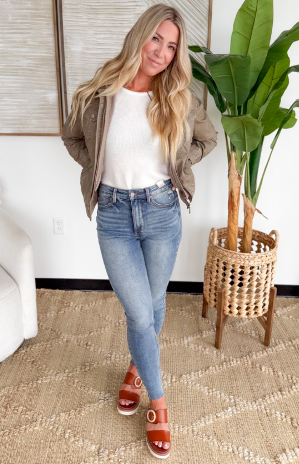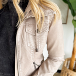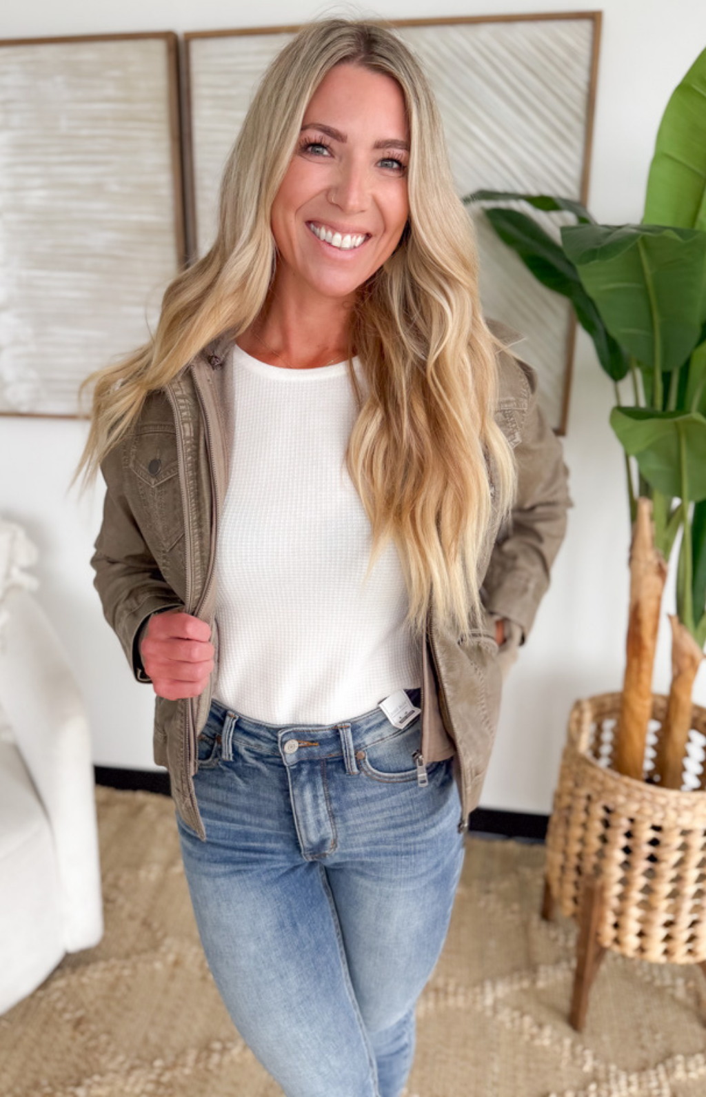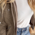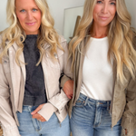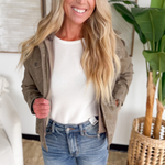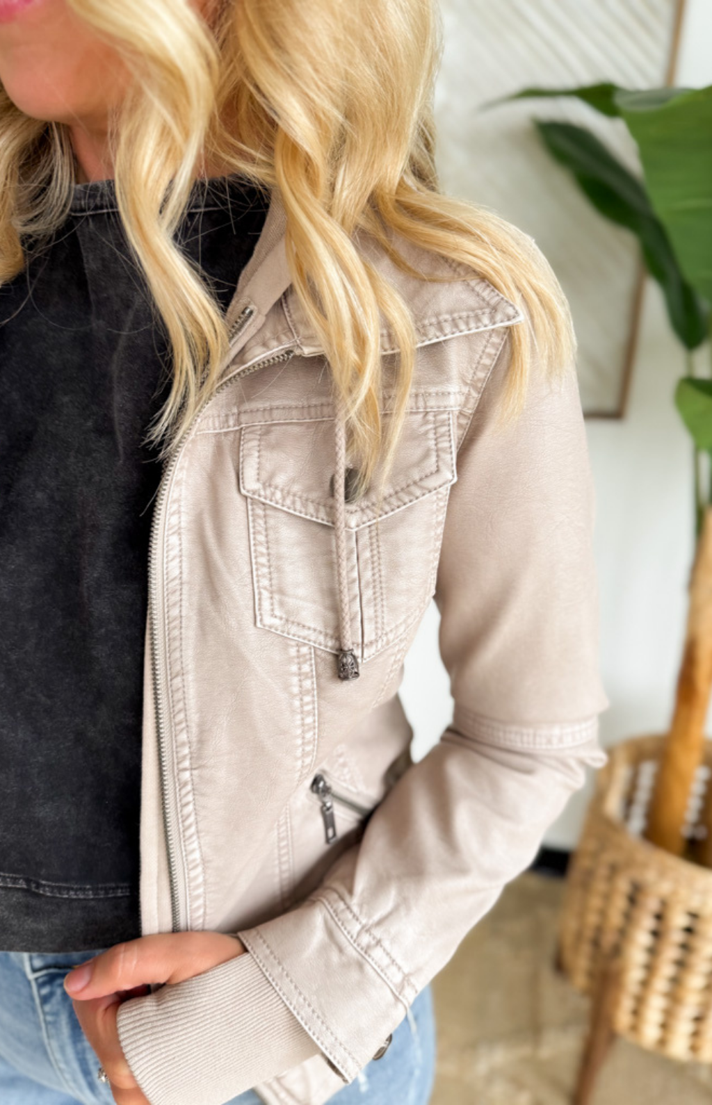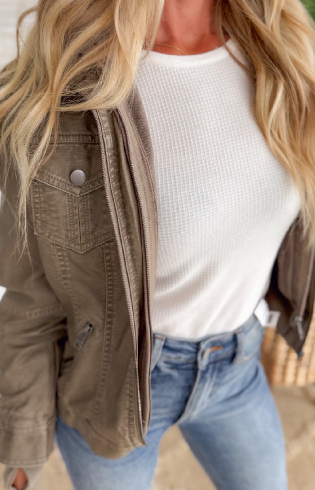 This hooded style jacket is oh so cute! Our Alanna Hooded Leather Jacket features vegan leather material, a drawstring hood, button chest pockets, and thumbhole cuffs. With side entry zip pockets and a dual front zipper closure, it is perfect to wear over a basic tee and your fav jeans!