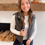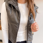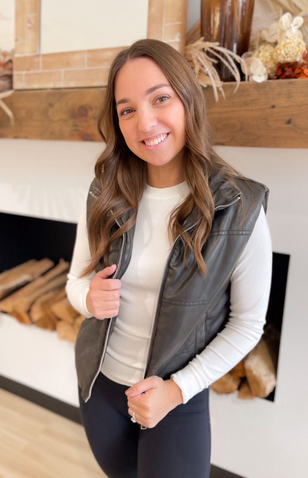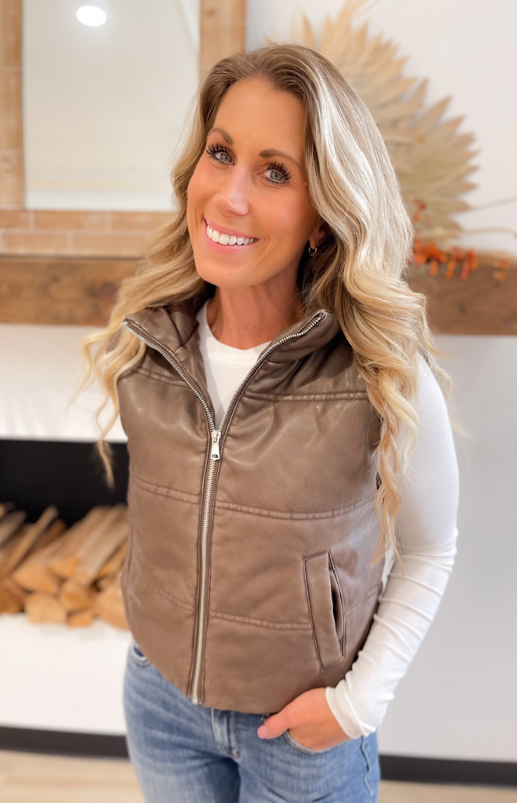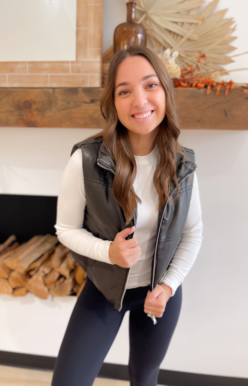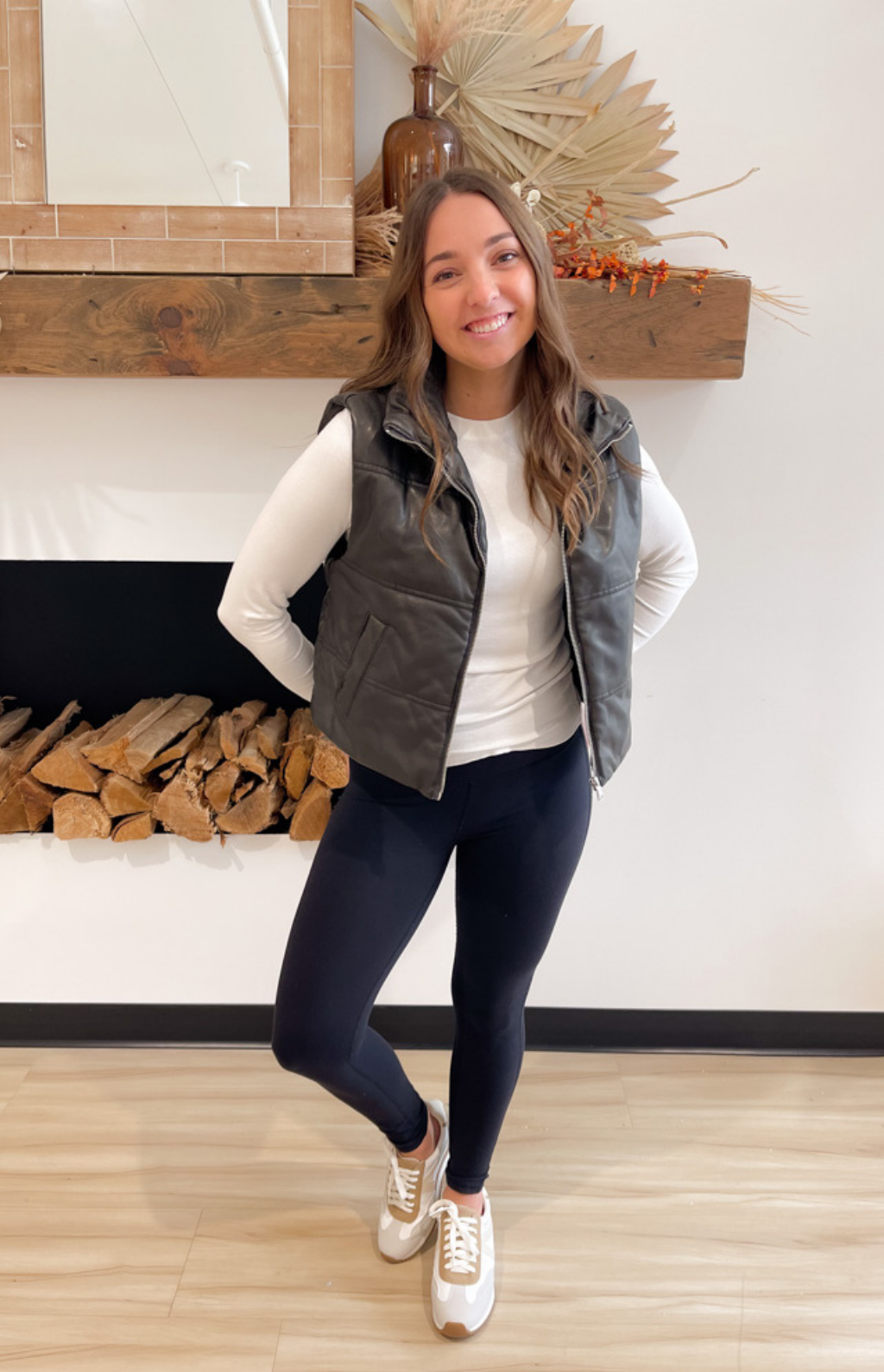 This leather puffer vest is the perfect mix of edgy and practical. The sleek leather finish gives it a polished, modern vibe, while the puffer style keeps it cozy and warm without the bulk. Easy to layer over sweaters, flannels, or even long-sleeve tees, it instantly elevates any outfit. With its versatile design, you can dress it up with boots or keep it casual with sneakers. Chic, functional, and effortless—this vest is a statement layer you’ll wear on repeat.