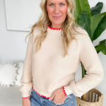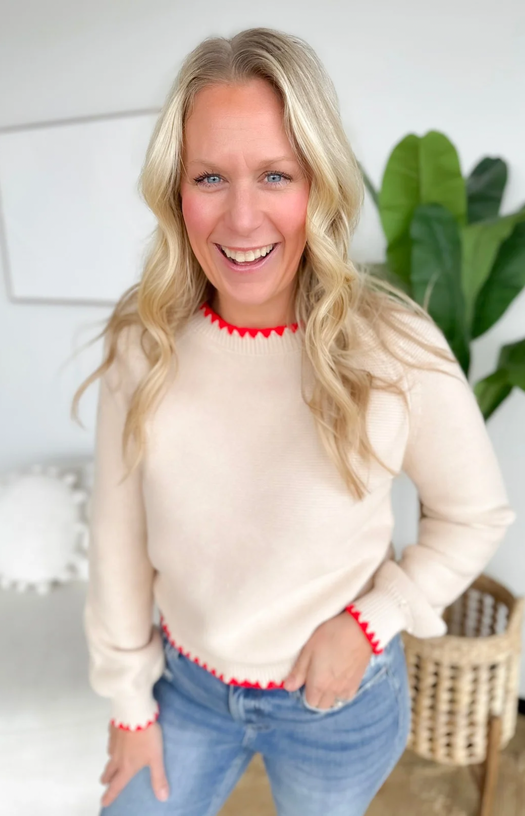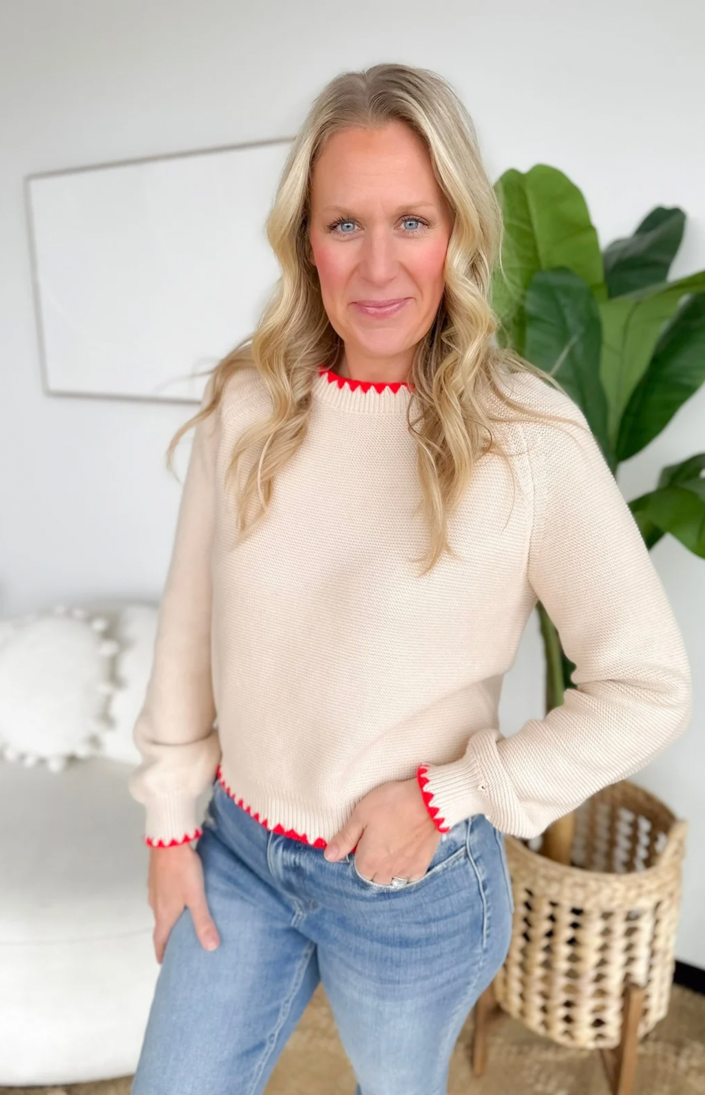 This almond knit sweater with red stitching trim detailing is the kind of piece that quietly stands out in the best way. The soft, cozy knit keeps you comfortable all day, while the contrast stitching adds just the right pop of color without feeling loud. Raglan sleeves create an easy, flattering fit that moves with you through busy days.
