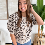 This animal print cardigan is playful, feminine, and just the right amount of bold. The button-up front makes it easy to wear on its own or layered over a cami, while the puff short sleeves add a sweet, stylish touch. Its lightweight knit is perfect for year-round wear—throw it on with jeans for a casual day or tuck it into a skirt for something more polished. The animal print brings a fun pop of personality to any outfit, making this cardigan a piece you’ll reach for when you want comfort and confidence in one.