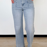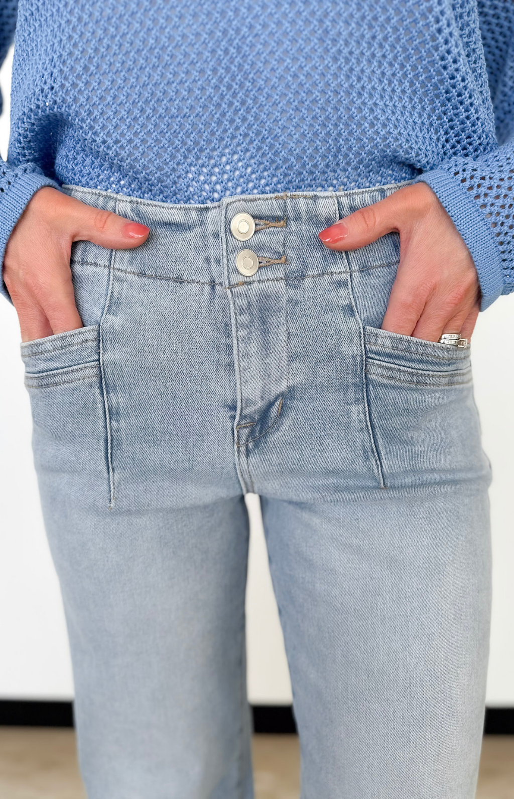 These light wash wide leg jeans are a spring and summer dream for busy, everyday style. The super high-rise waistband with a double button and zip closure gives you a flattering, held-in fit that feels secure and comfortable all day long. The wide leg silhouette keeps things breezy and on-trend, perfect for warm weather dressing.