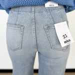 - Details: Super high rise, fabric has stretch, wide leg, light wash, 4 pocket design, zip and double button closure, inseam: 30"
