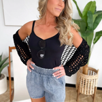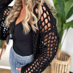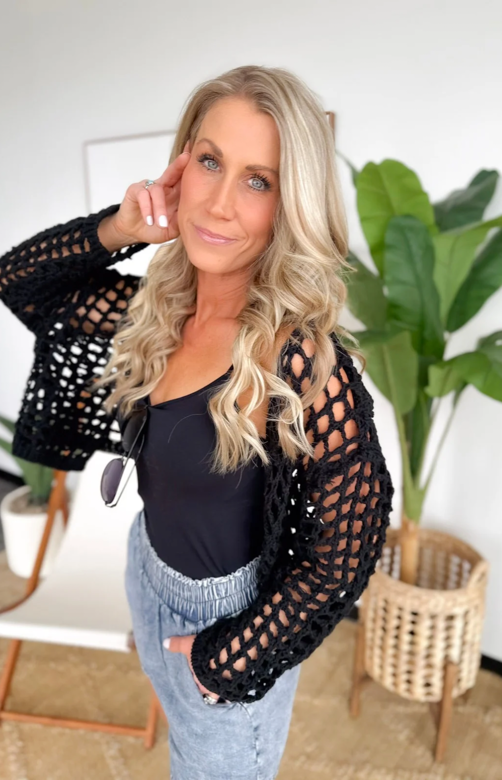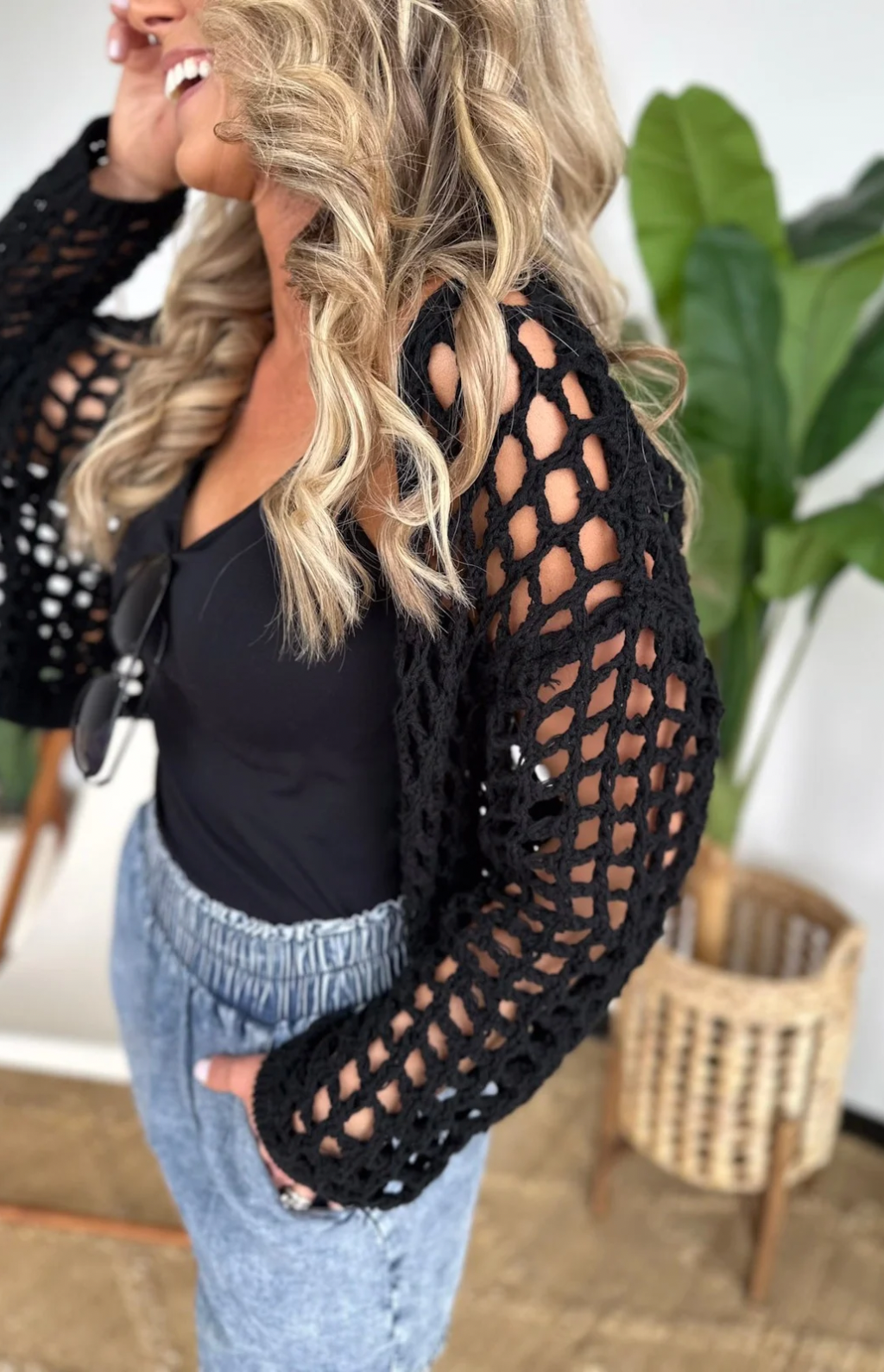 This black open-knit cropped cardigan is the vacation layer you didn’t know you needed. The crochet-like texture feels breezy and beachy, perfect for warm days and cool ocean air. Its cropped fit makes it easy to throw over tanks, swimsuits, or sundresses while still keeping your outfit light and flirty. It adds just the right touch of coverage without ever feeling hot or heavy. Pack it once and you’ll wear it on repeat—from poolside lounging to sunset dinners.