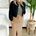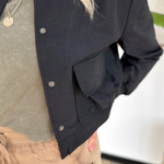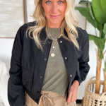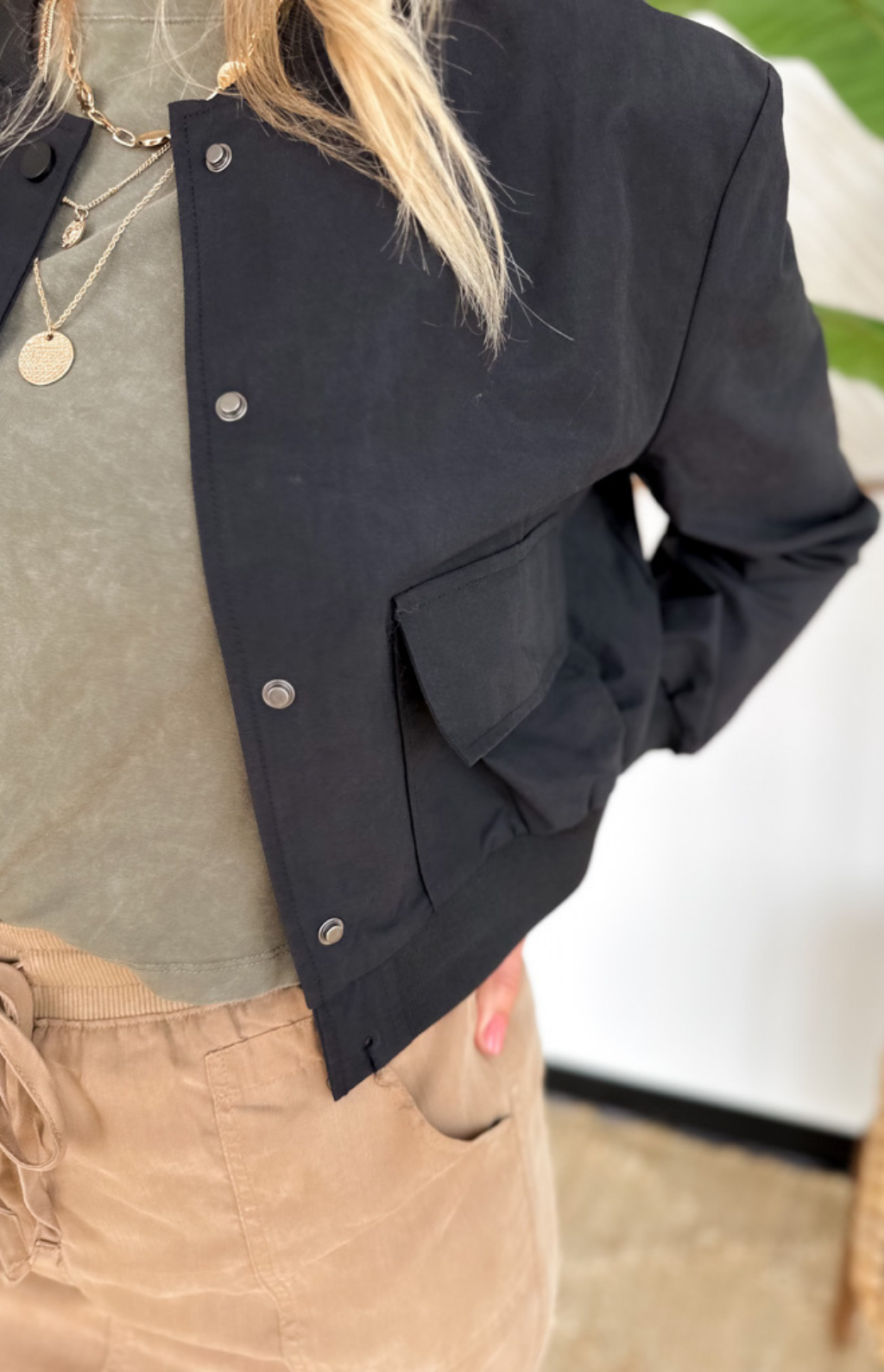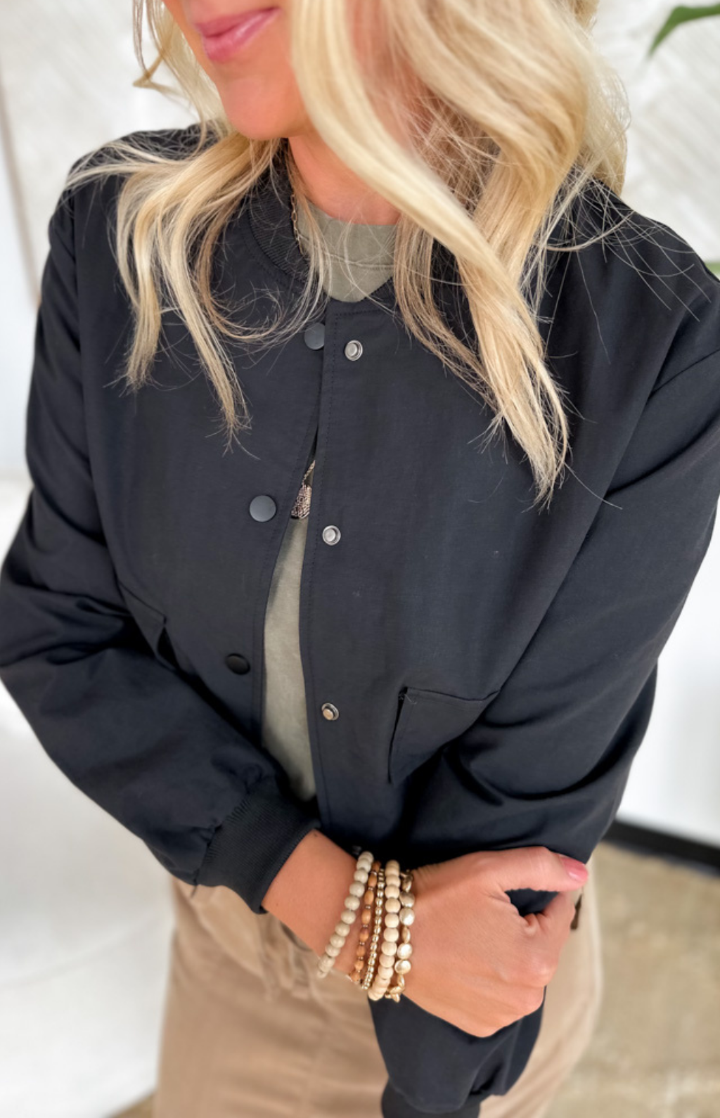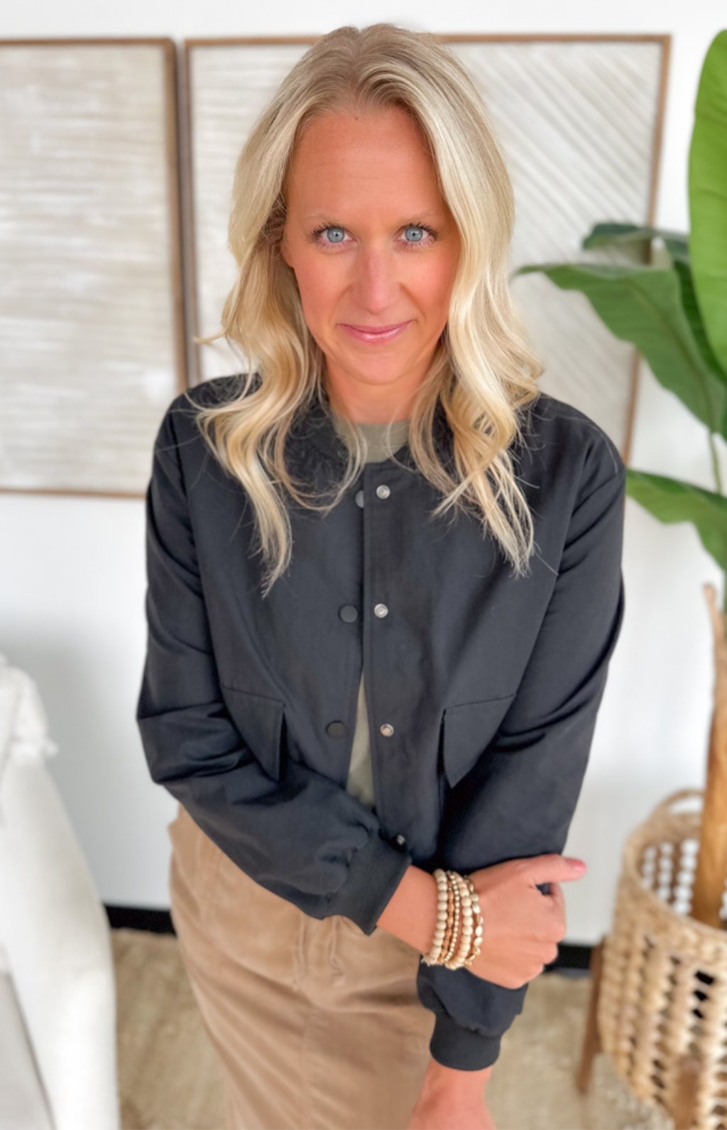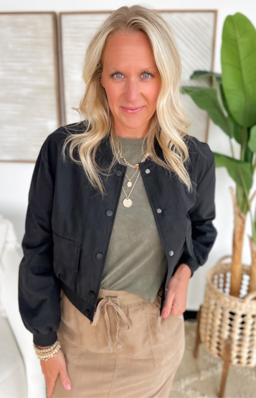 This cropped bomber jacket is the perfect mix of casual edge and everyday wearability. With a slightly boxy cut and ribbed cuffs, neckline, and hem, it keeps its shape while giving you a comfortable fit. The button closure adds a timeless touch, and side pockets bring both function and style. Easy to pair with jeans, skirts, or joggers, this jacket is your go-to for layering when you want to look put-together without trying too hard.