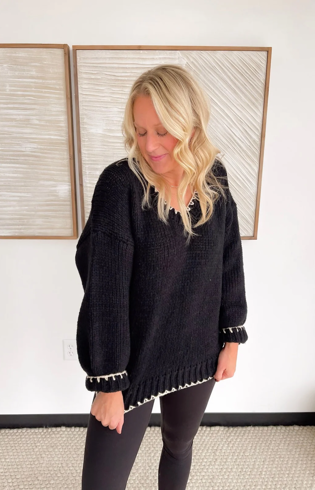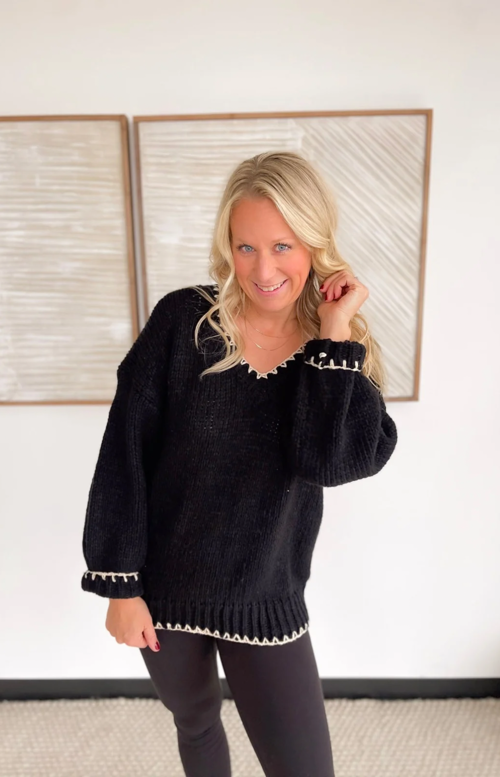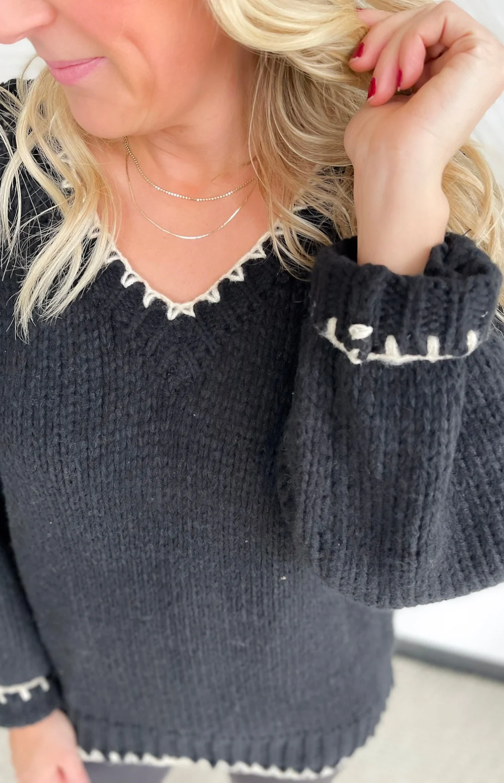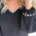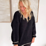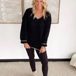 This black knit sweater is the perfect blend of simple and standout. The contrast cream stitching along the hemlines and neckline adds just the right amount of detail, giving it a polished, elevated look without feeling fussy. The knit is soft and comfy, making it an easy choice for long workdays, errands, or dinner out. It’s one of those pieces that pairs effortlessly with jeans, trousers, or a cute skirt—whatever your day calls for. You’ll look put together in seconds, no extra thought required.