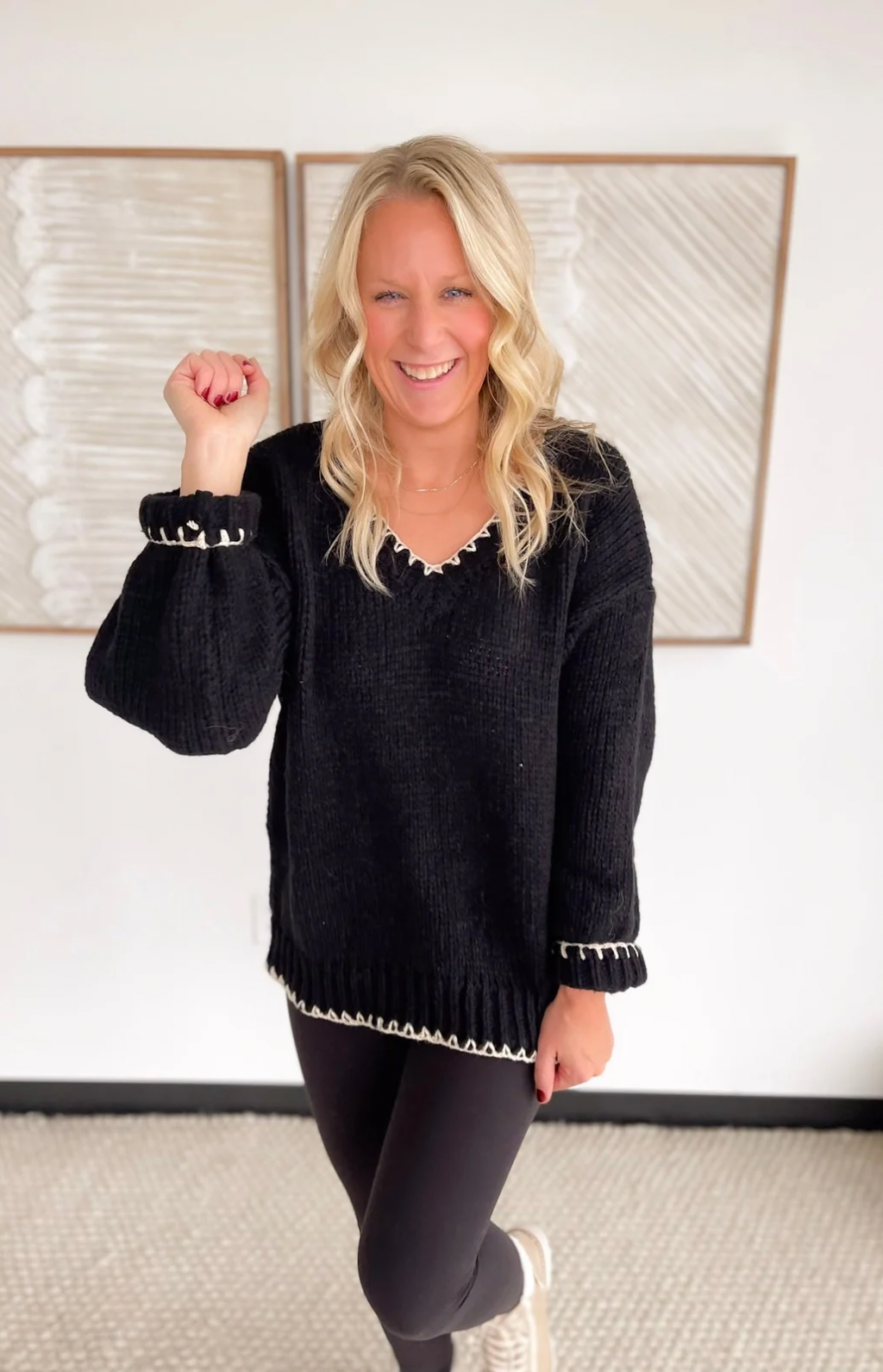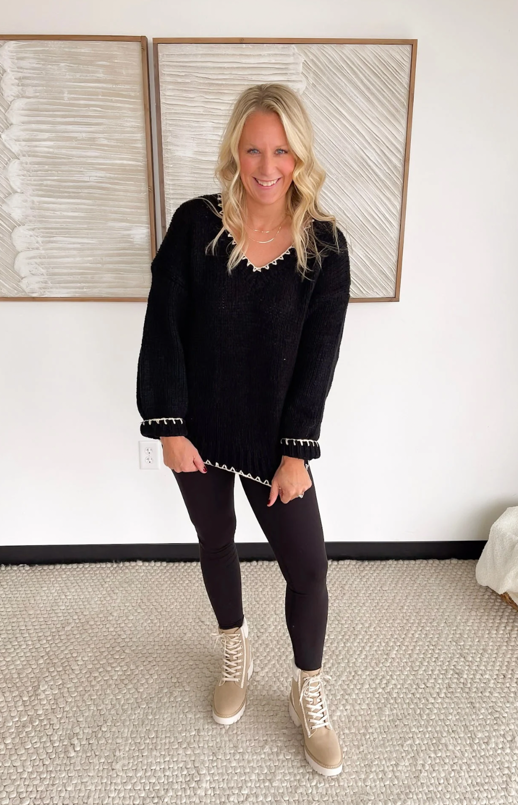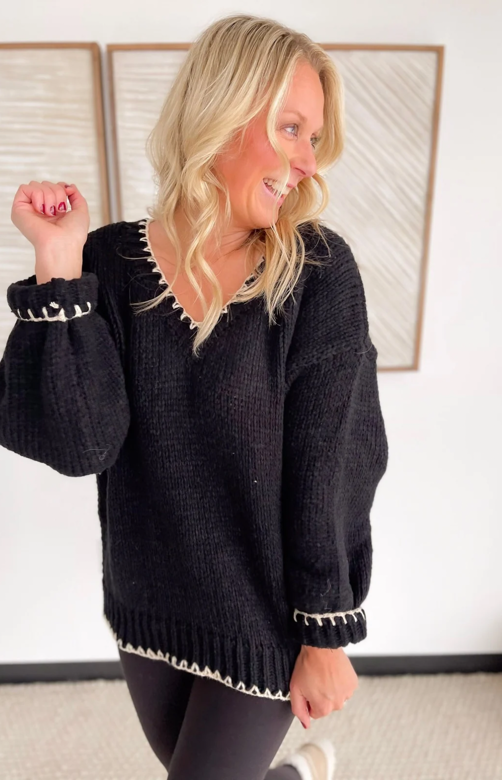 This black knit sweater is the perfect blend of simple and standout. The contrast cream stitching along the hemlines and neckline adds just the right amount of detail, giving it a polished, elevated look without feeling fussy. The knit is soft and comfy, making it an easy choice for long workdays, errands, or dinner out. It’s one of those pieces that pairs effortlessly with jeans, trousers, or a cute skirt—whatever your day calls for. You’ll look put together in seconds, no extra thought required.