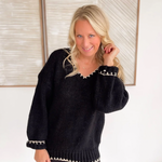 Black Knit V-Neck Contrast Stitch Sweater