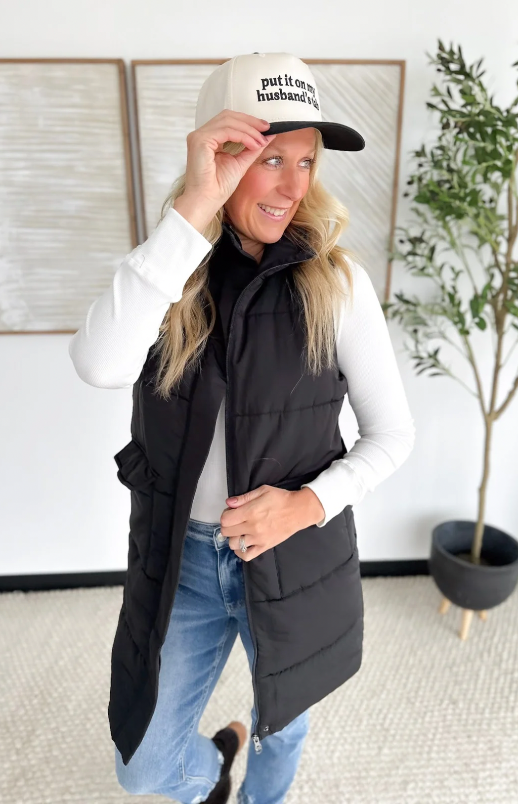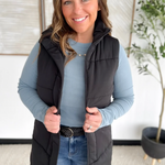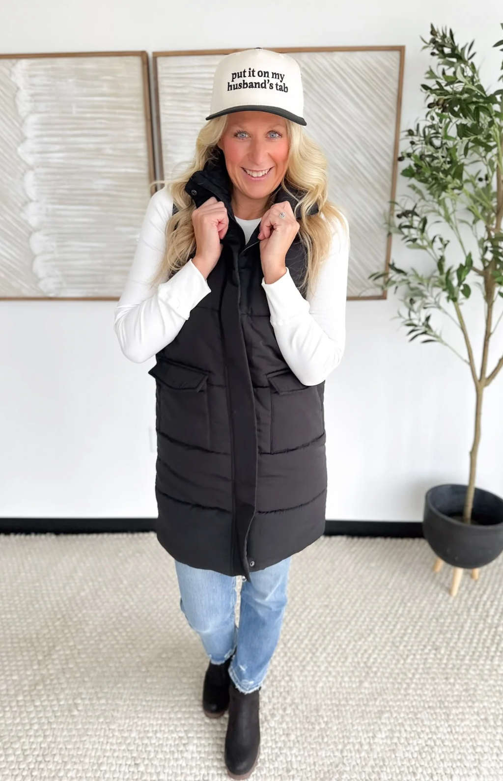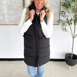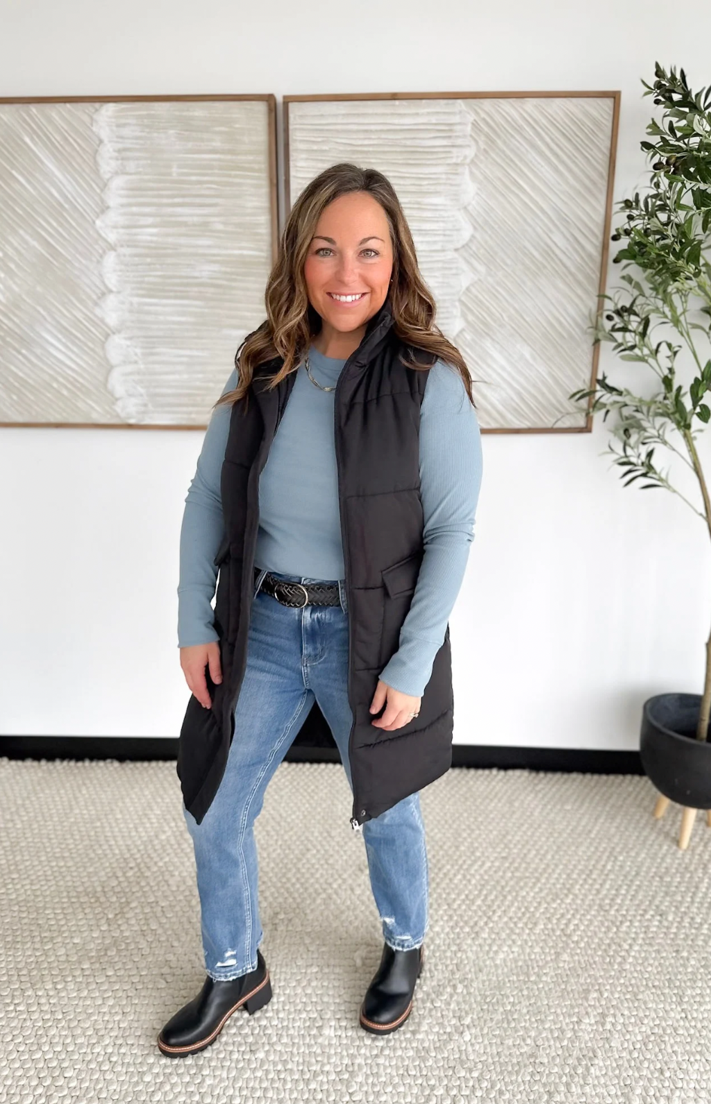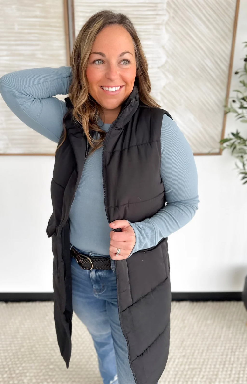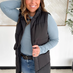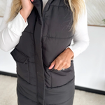 This black puffer long vest is the ultimate layering piece for cool-weather days. The lightweight yet insulated design keeps you warm without feeling bulky, while the long length adds extra coverage and a sleek silhouette. Front pockets provide practicality and a laid-back touch, perfect for keeping your hands warm or stashing essentials. Effortless to layer over sweaters, long sleeves, or hoodies, this vest is a versatile, go-to piece for style and comfort all season long.