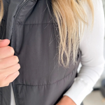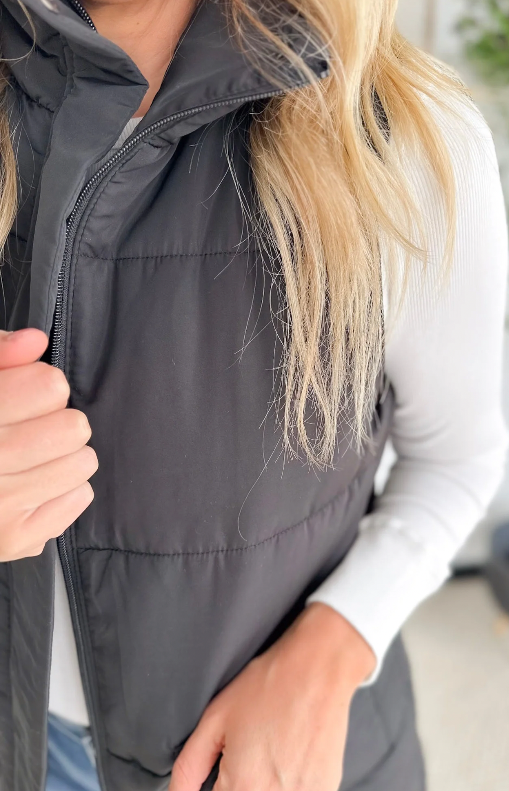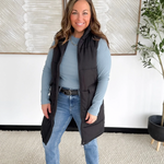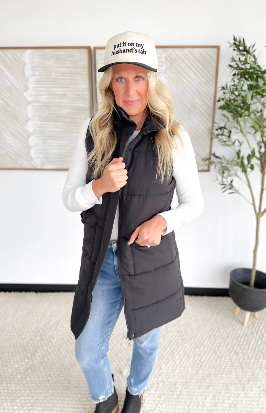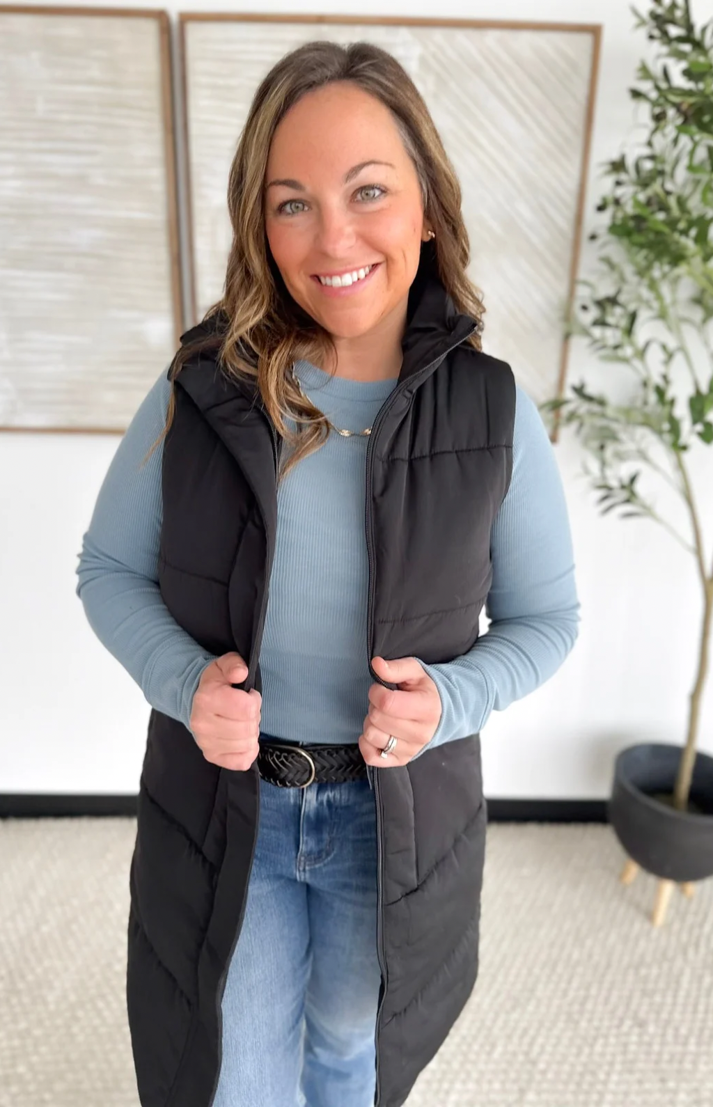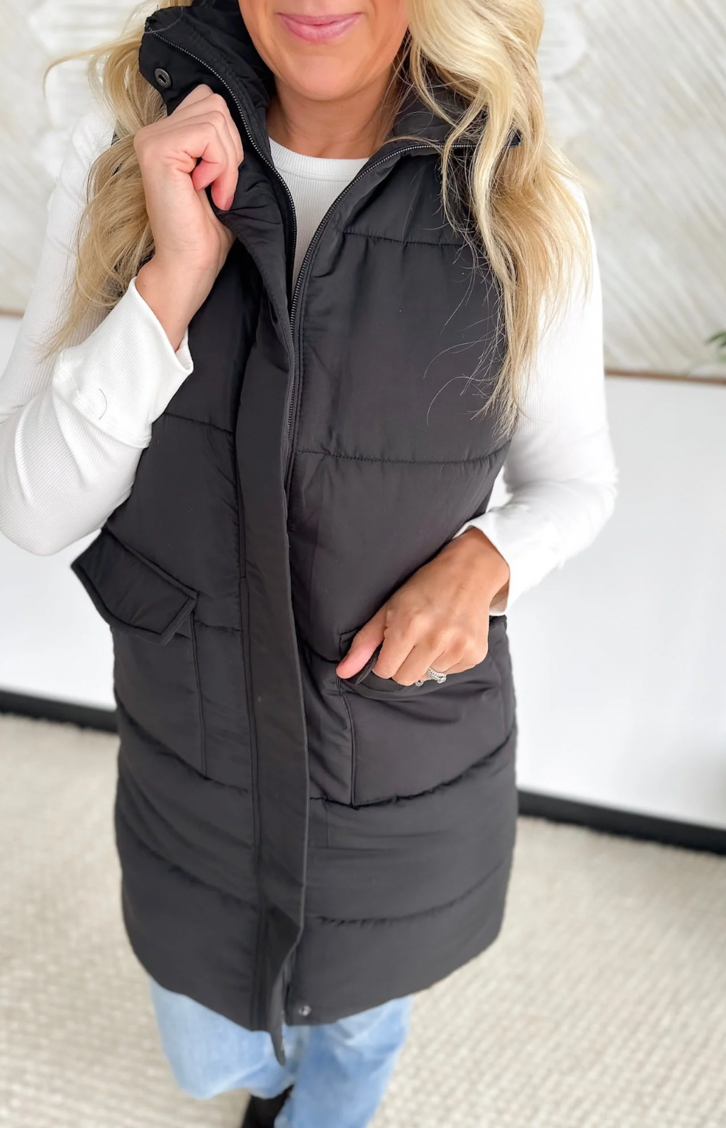 This black puffer long vest is the ultimate layering piece for cool-weather days. The lightweight yet insulated design keeps you warm without feeling bulky, while the long length adds extra coverage and a sleek silhouette. Front pockets provide practicality and a laid-back touch, perfect for keeping your hands warm or stashing essentials. Effortless to layer over sweaters, long sleeves, or hoodies, this vest is a versatile, go-to piece for style and comfort all season long.