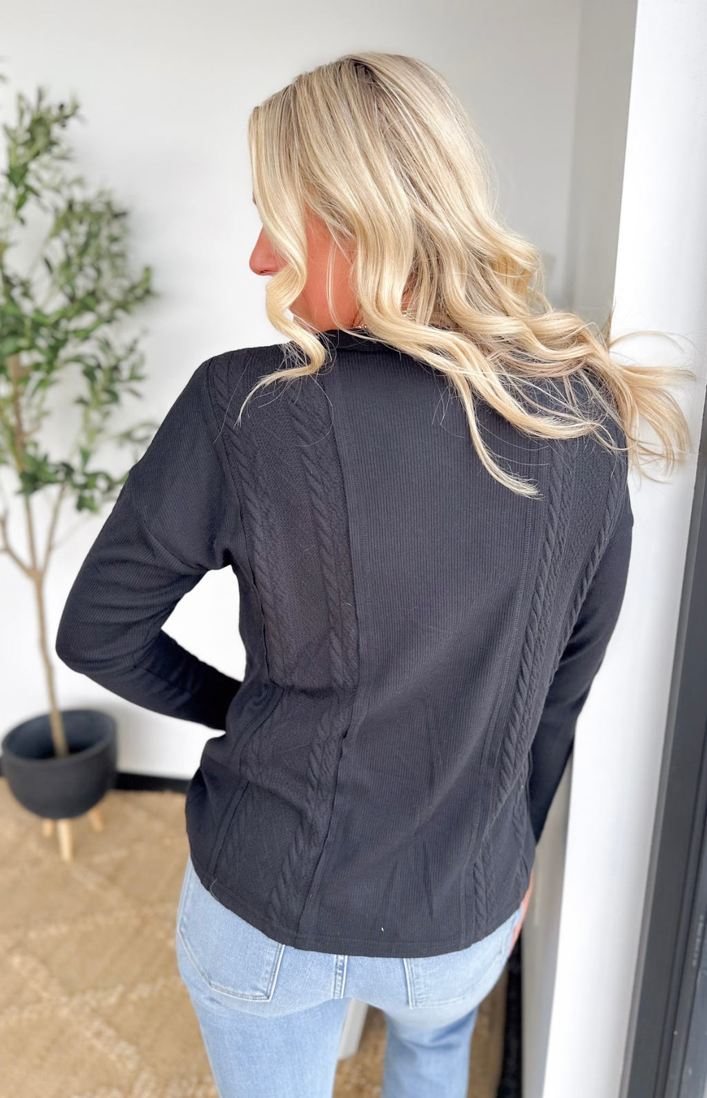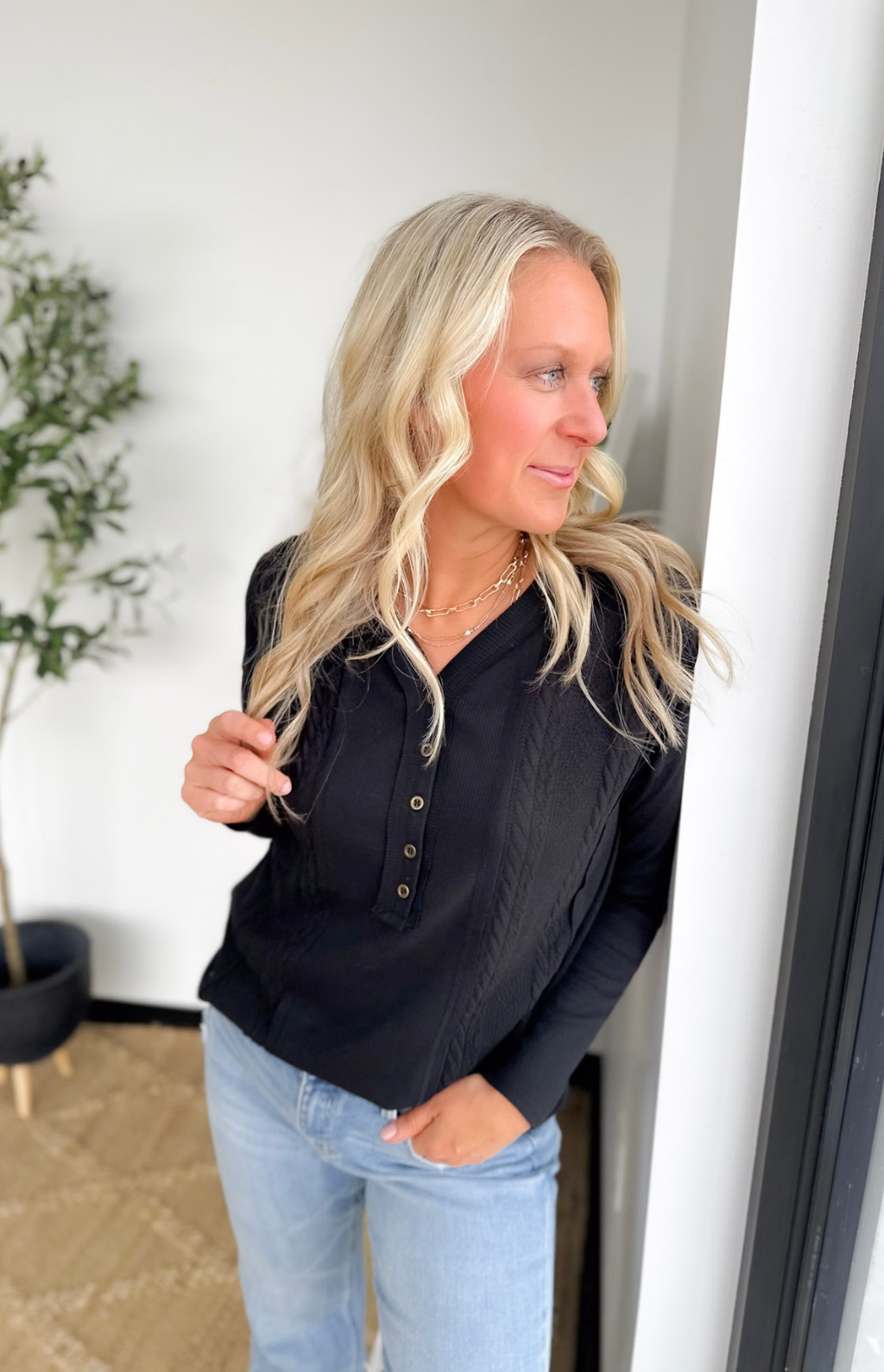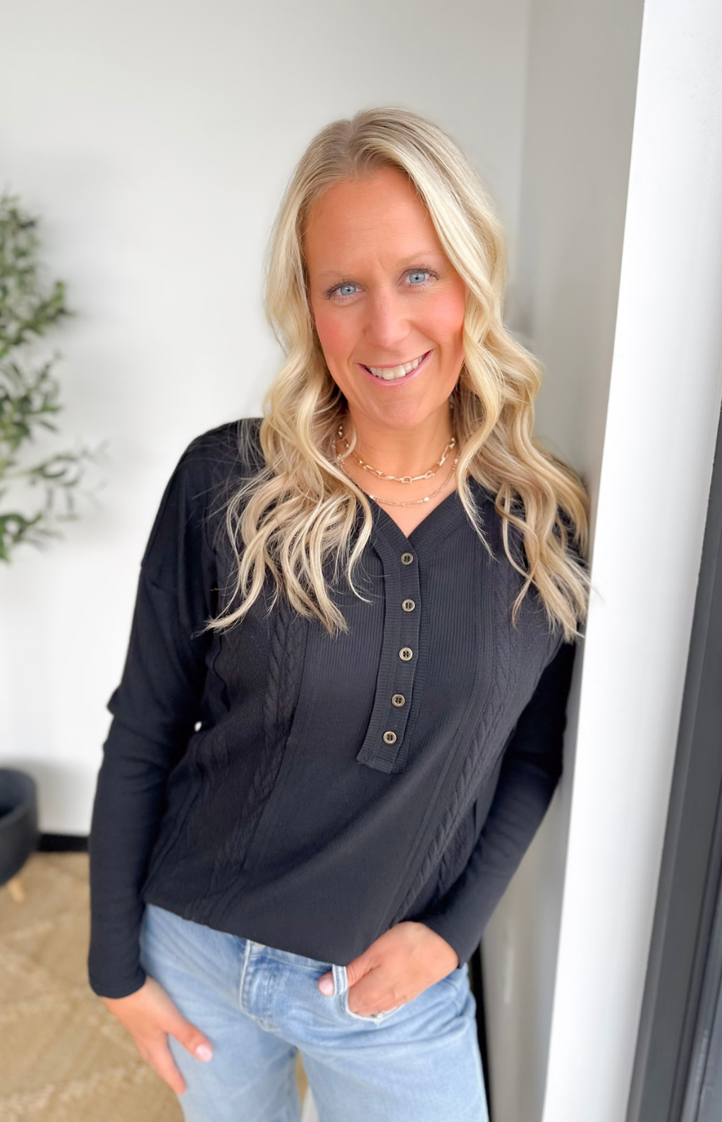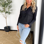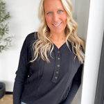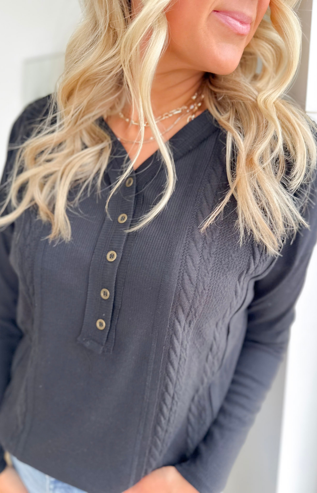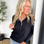 This lightweight black long-sleeve top is a subtle twist on a classic, with cable knit detailing that adds texture and interest without weighing you down. The half-button neckline gives you just enough polish to look put together, while keeping it easy to throw on and go. Its relaxed fit and soft knit make it perfect for busy days when comfort matters as much as style. Pair it with jeans, leggings, or layered under a jacket—it’s effortless, versatile, and the kind of top that makes everyday outfits feel a little extra special.