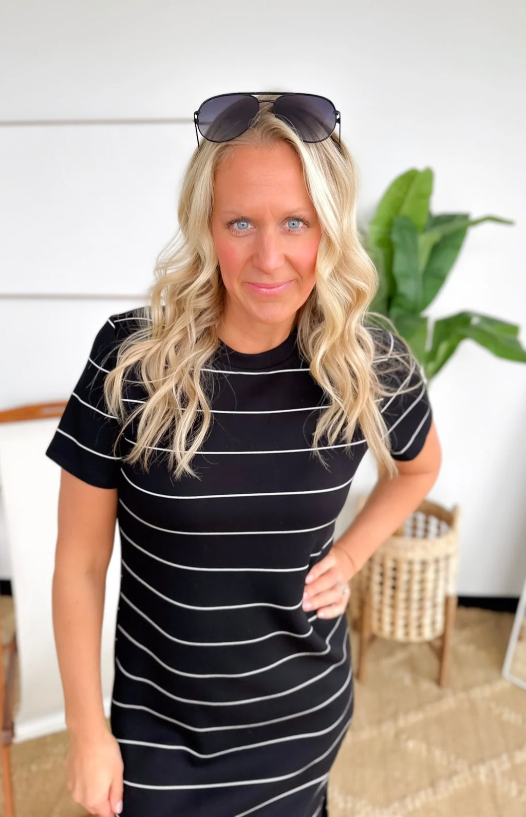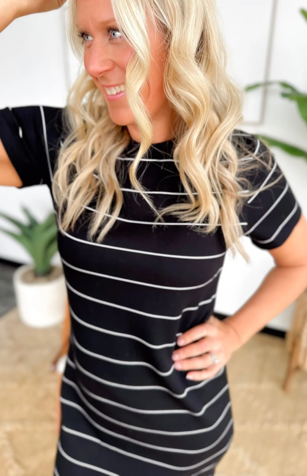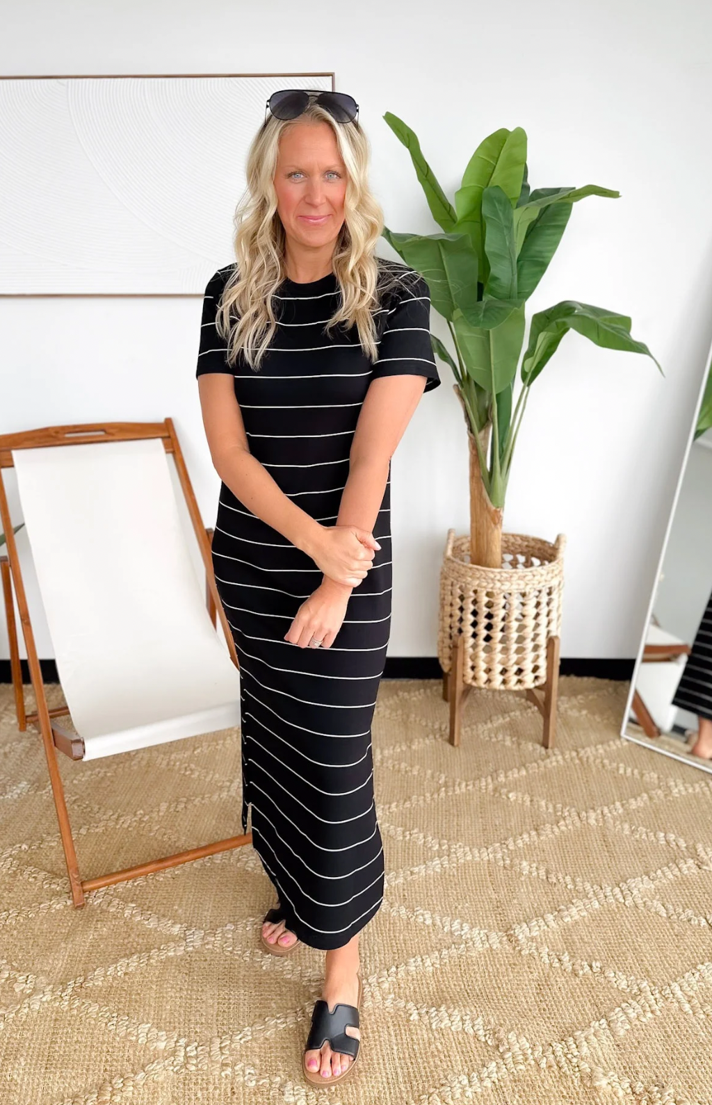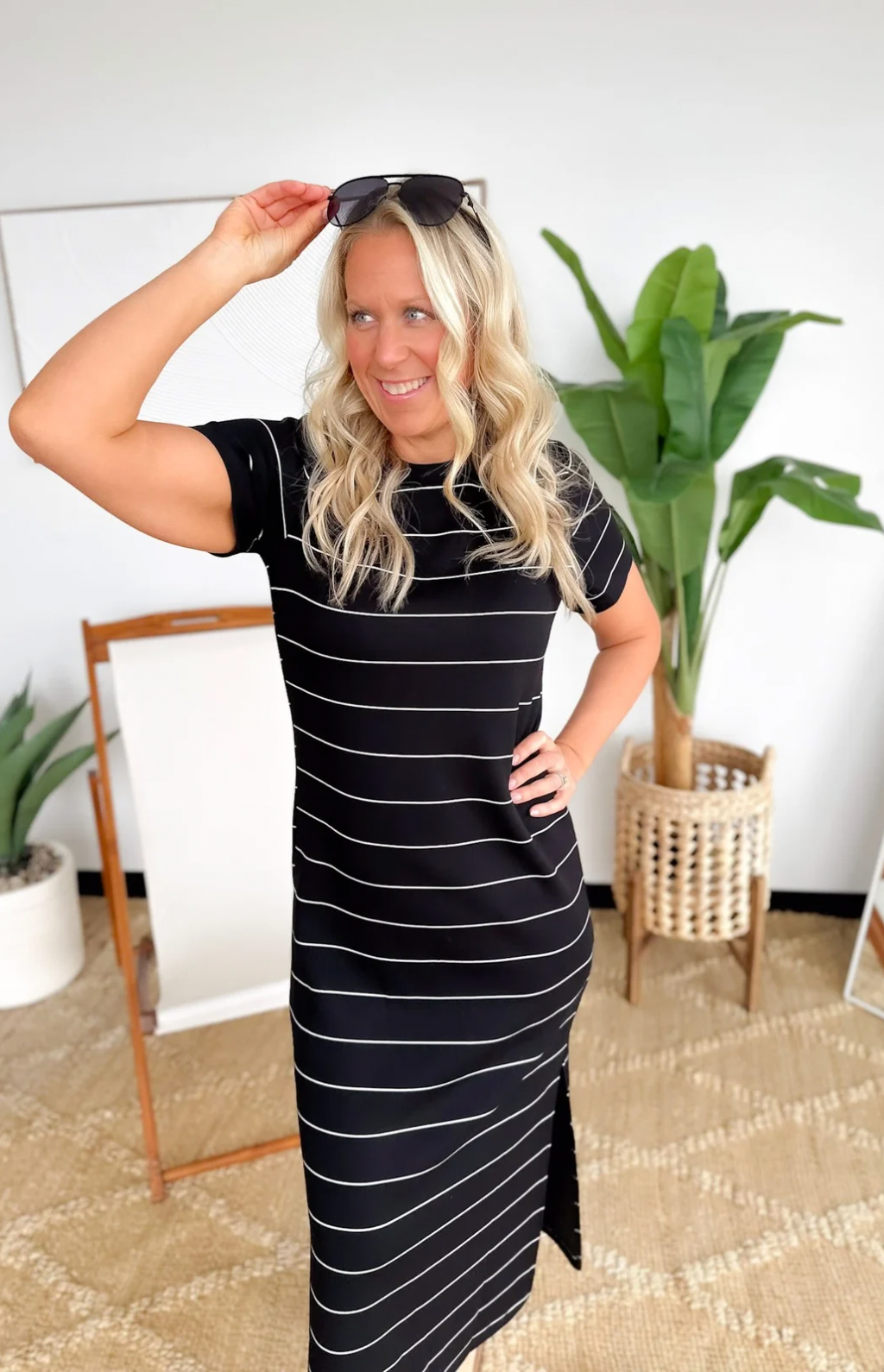 This black soft knit striped maxi dress is a vacation must-have you’ll be so glad you packed. The stretchy fabric keeps you comfy for travel days, sightseeing, and long dinners out, while the short sleeves and thin white stripes keep it effortlessly chic. The maxi length gives you easy coverage without feeling heavy, making it perfect for warm destinations. It’s a true throw-on-and-go piece that still looks polished with zero effort. Pair it with sandals by day or dress it up with wedges at night and enjoy feeling confident wherever your trip takes you.