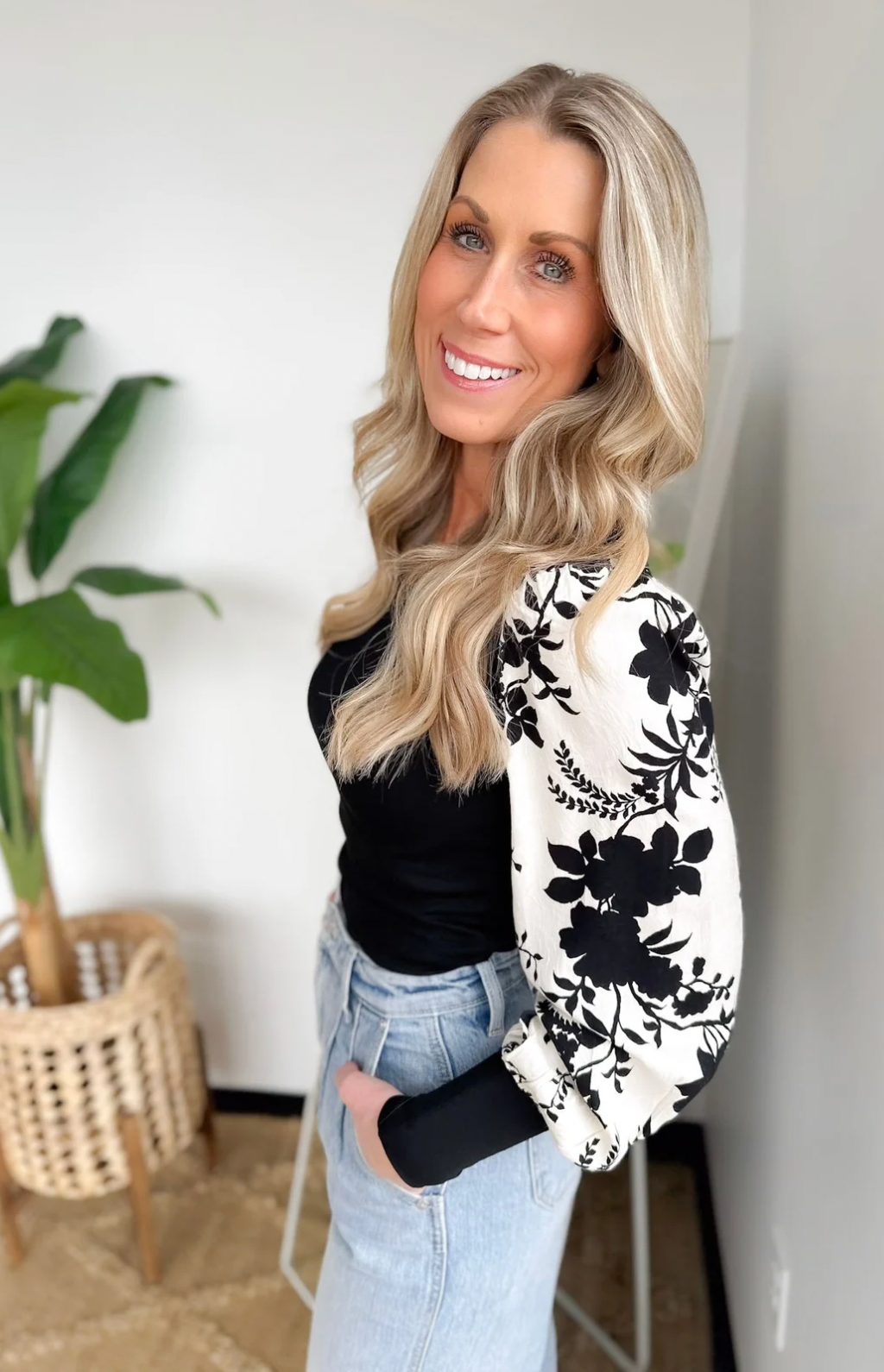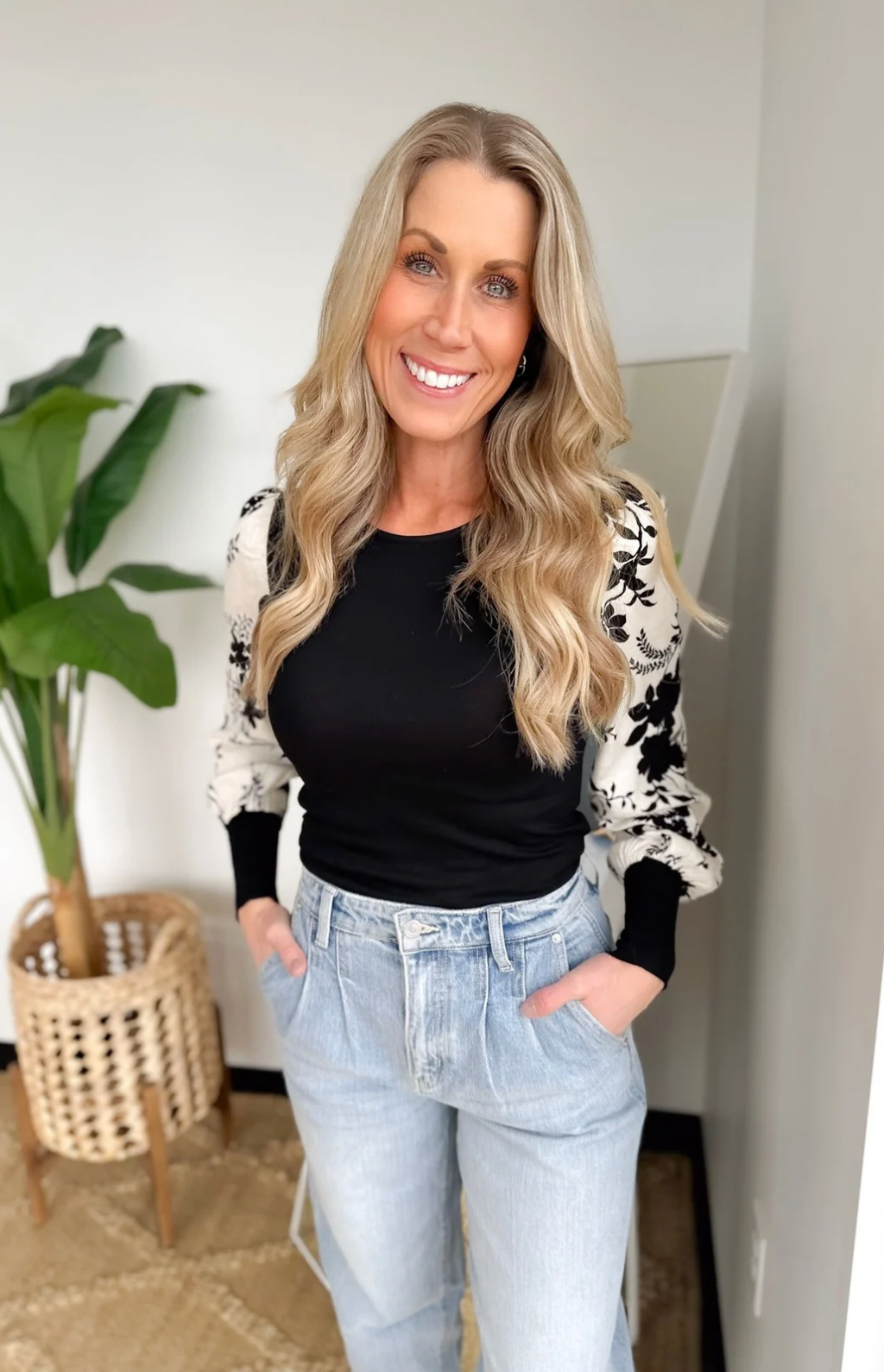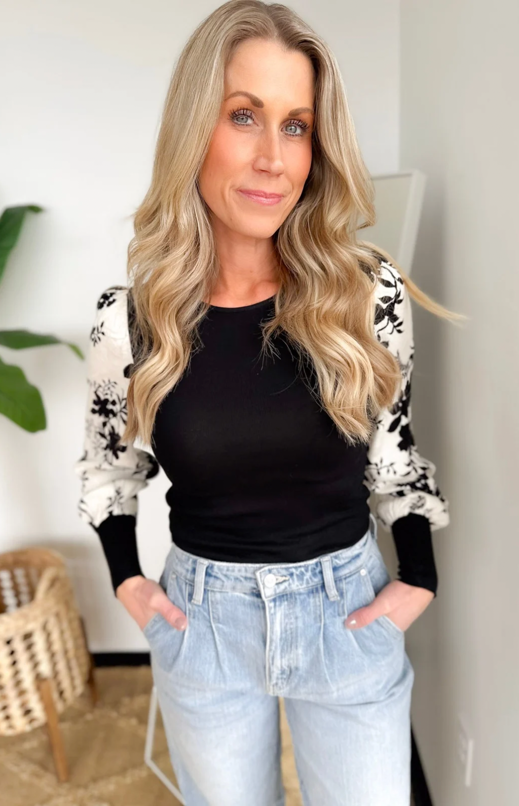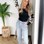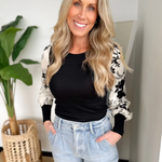 Black/White Floral Contrast Sleeve Top