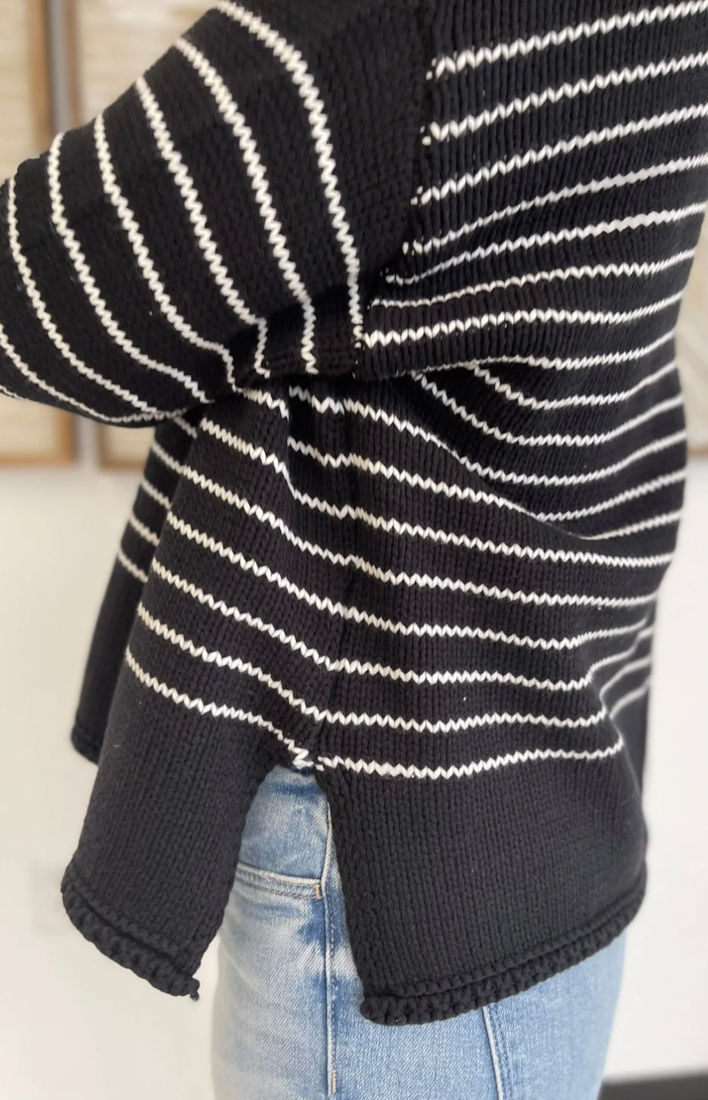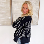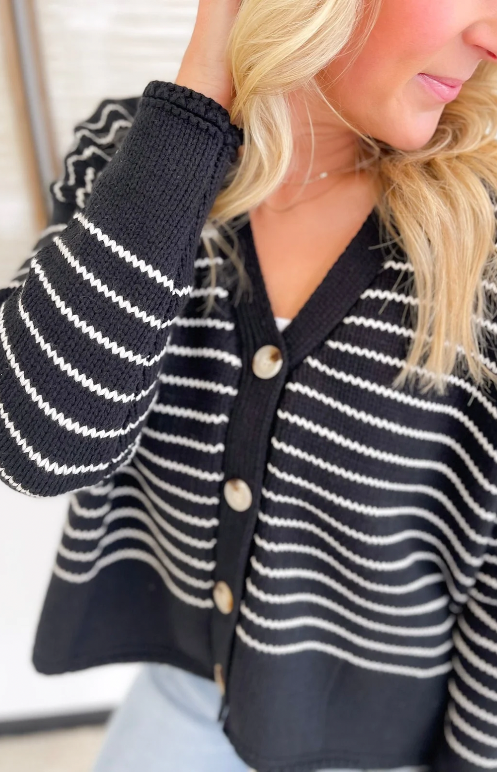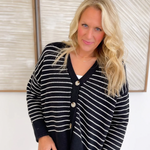 This black knit cardigan is that easy, effortless layer you’ll reach for on the busiest mornings. The thin white stripes add just enough detail to feel polished without trying, and the relaxed fit keeps things comfy whether you’re running errands or heading into the office. The button-front design and flattering V-neckline make it perfect for tossing over tanks, tees, or your favorite dress. It’s midweight, versatile, and one of those pieces that instantly pulls your whole look together. Truly a must-have for those “I need to look cute in five minutes” days.
