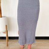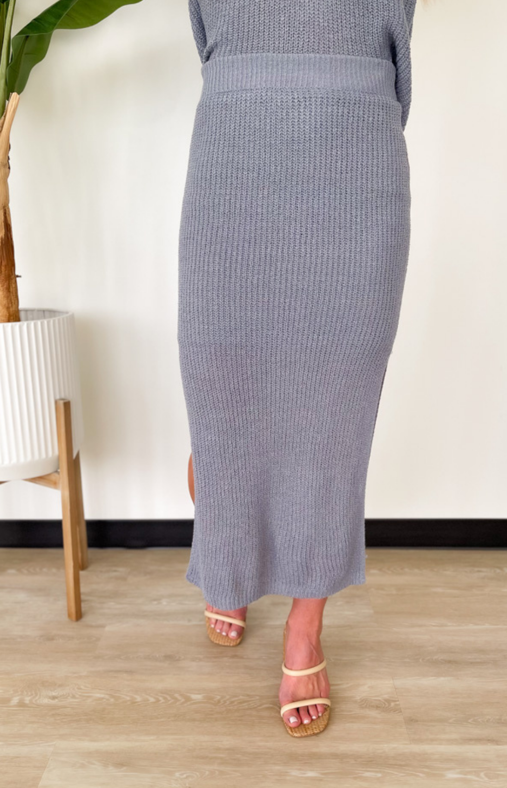 Embrace effortless comfort and style with this new Elastic Waistband Skirt! Featuring a gorgeous dusty blue hue, a soft knit material and a comfy elastic waistband. The classic midi length and fitted silhouette make this skirt a flattering choice for any occasion. Style with the matching top for a cute and trendy matching set!