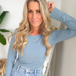 This blue ribbed long sleeve top is a sleek and versatile piece you’ll wear on repeat. The fitted silhouette hugs in all the right places, giving you that polished, put-together look without sacrificing comfort. A rounded hemline adds a soft, flattering finish that pairs perfectly with jeans, trousers, or a skirt. Dress it up with layered jewelry and heels or keep it simple for an easy everyday style—it’s the perfect mix of classic and chic.