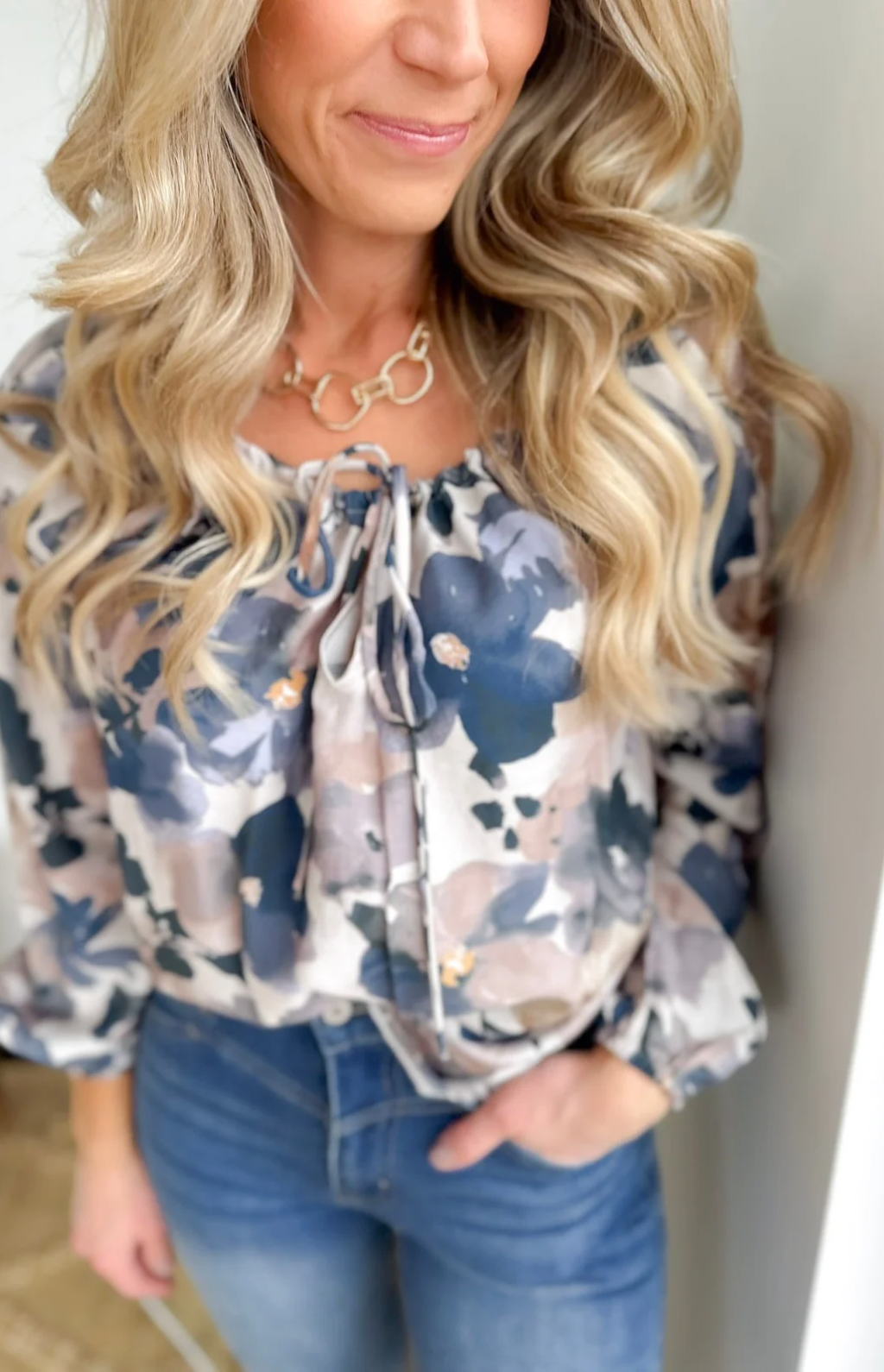 This lightweight long sleeve top is an instant outfit-maker with its stunning blue and taupe floral pattern. The rounded neckline with a sweet front tie adds just the right touch of femininity without feeling fussy. Soft and airy, it’s perfect for busy days when you want to feel comfortable but still look pulled together.