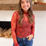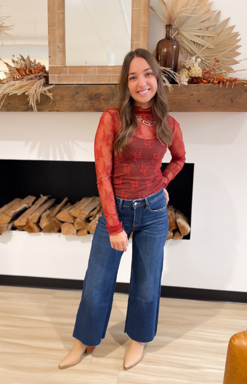 This brick-colored lace top is the perfect mix of feminine and bold. The long sleeves and intricate lace detailing give it a romantic, elevated feel, while the rich brick hue adds warmth and depth. Lightweight and breathable, it layers beautifully over a cami for everyday wear or can be dressed up for special occasions. Pair it with jeans for a chic casual look or with a skirt and heels for something more polished. A statement piece that’s equal parts graceful and versatile.