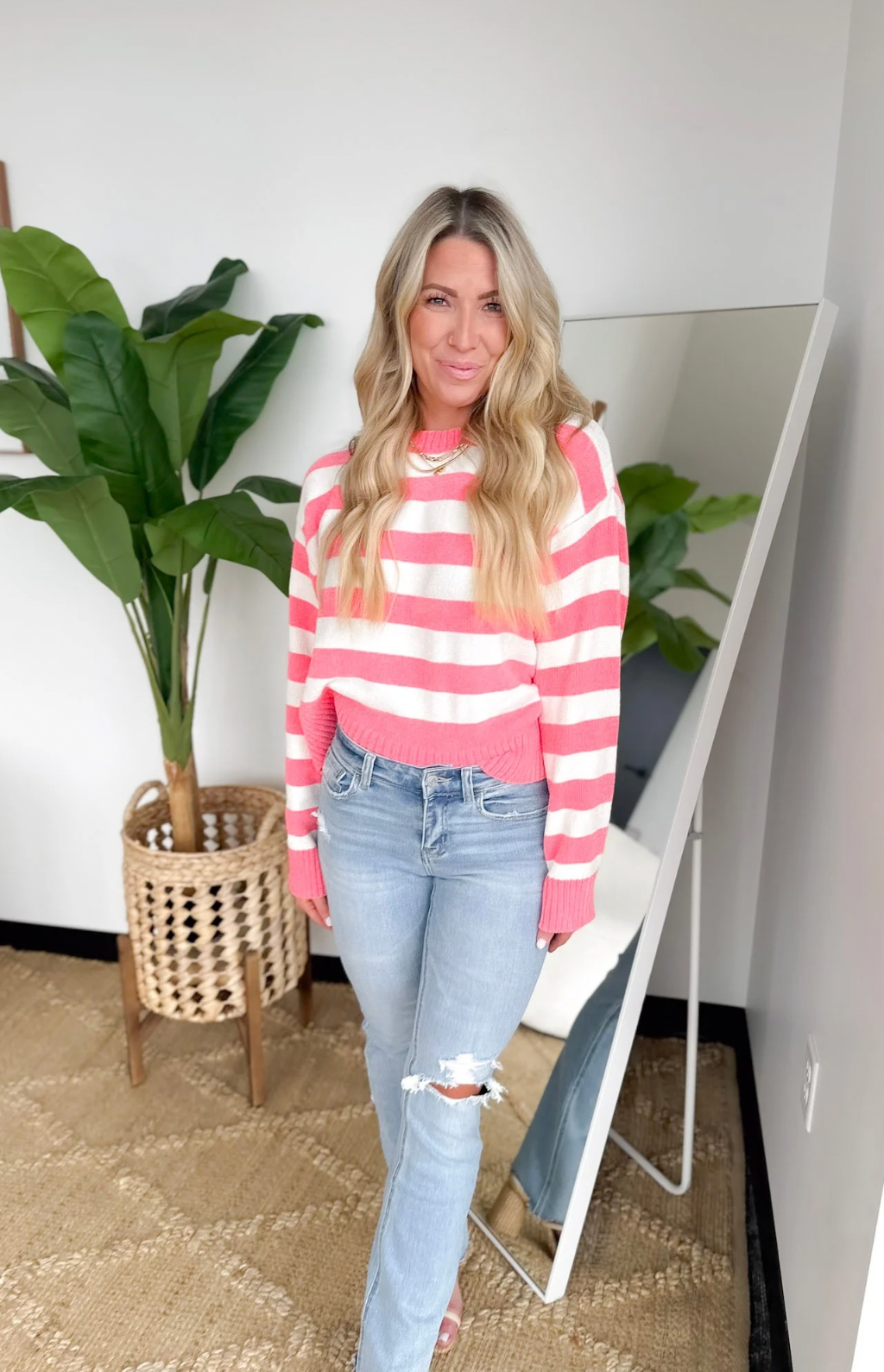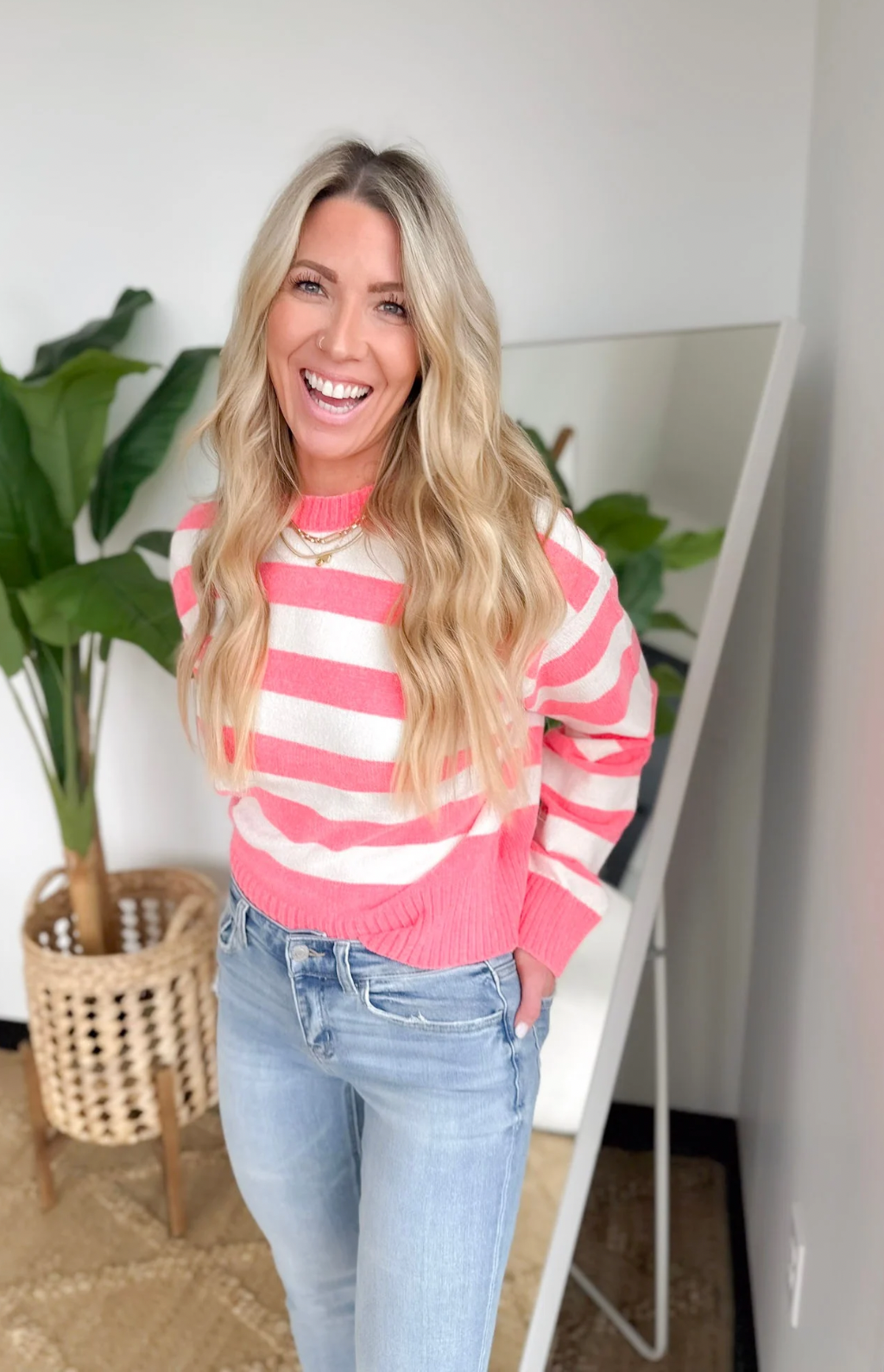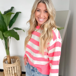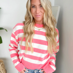 This bright pink and cream striped soft knit sweater brings a fun pop of color while still feeling easy and wearable. The cozy, lightweight knit keeps you comfortable without weighing you down, perfect for busy days on the go. The playful stripes add personality, while the classic fit makes it simple to style with denim or layered over your favorite basics.