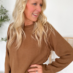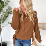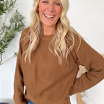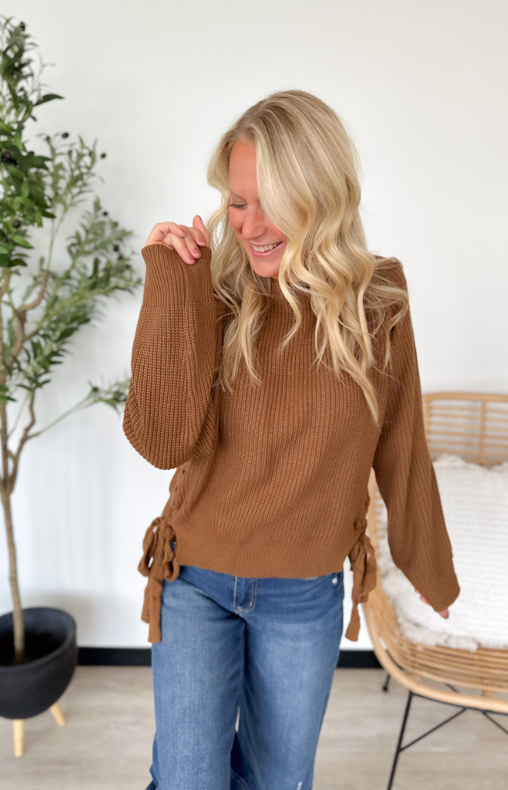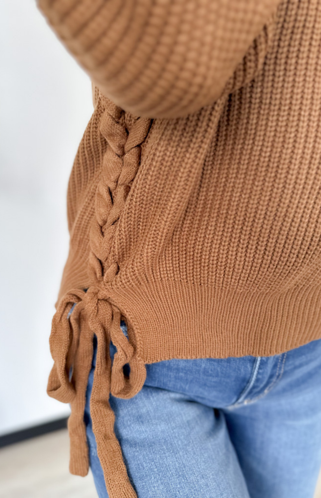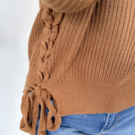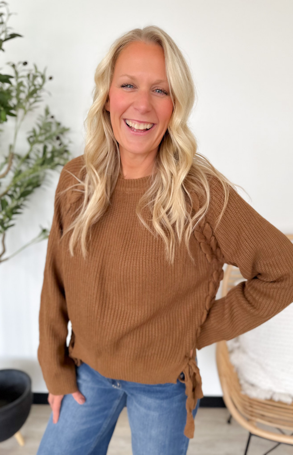 This brown knit sweater is cozy with a touch of unique charm. The braided detailing along the sides adds subtle texture and a hint of something special, while the soft knit keeps it perfectly comfortable for everyday wear. Its warm brown hue makes it easy to pair with denim or leggings for a laid-back yet polished look. With its classic fit and thoughtful details, this sweater brings effortless style to even your busiest days.